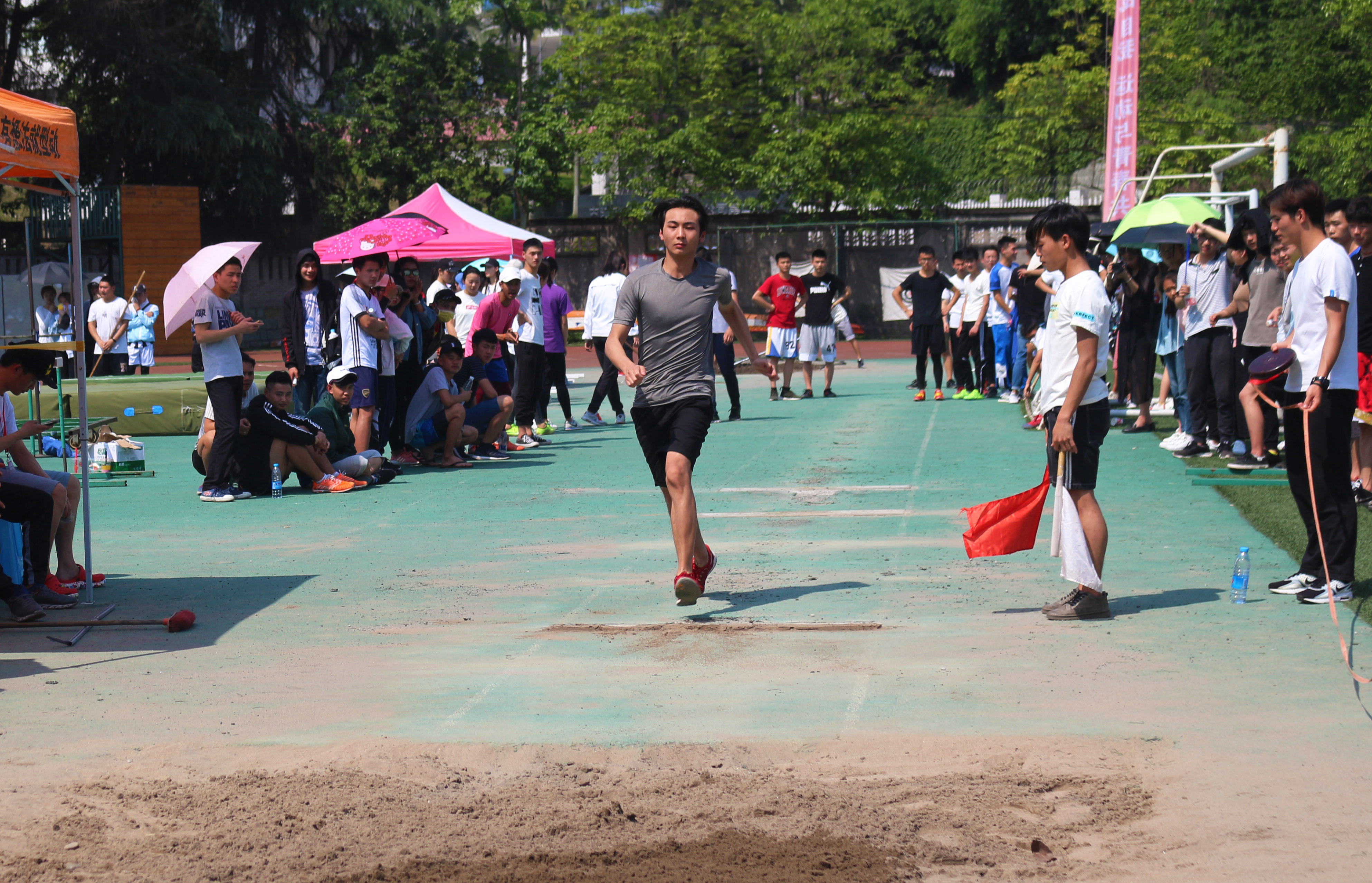 4月18号上午8点,公司于田径场举行十八届运动会。操场上气氛热烈,加油声此起彼伏,处处洋溢着年轻的活力。上午9点,女子跳远比赛在运动场开赛。
