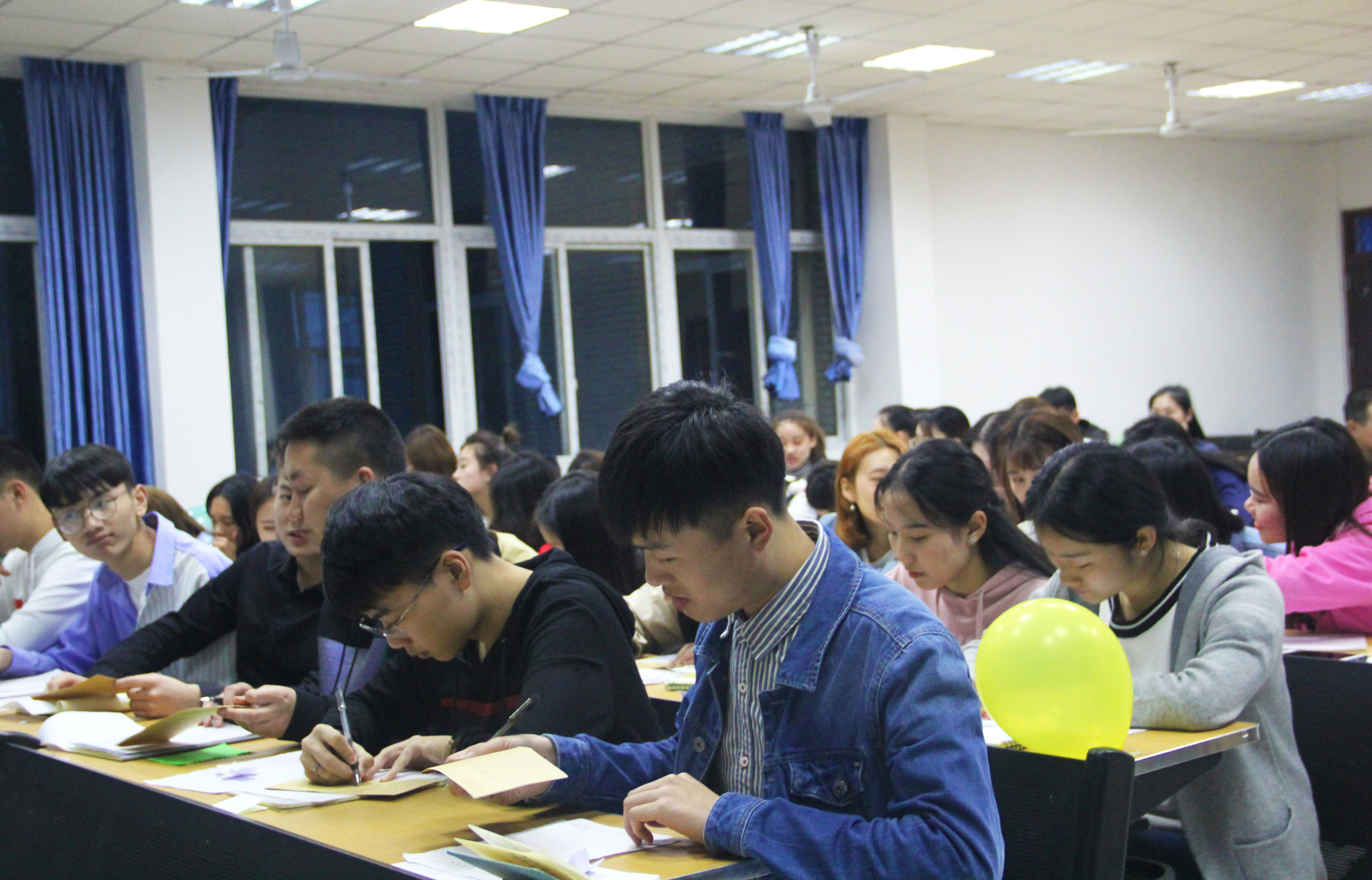 主持人引用保尔柯察金的名言,点明了此次班会的主题,“人最宝贵的东西就是生命,生命对于我们只有一次,正值青春大好年华的我们拥有着火一样的激情,因为我们年轻,所以我们有资本也应该去挑战、去奋斗、去义无反顾地去追逐梦想”。班主任刘丽娜老师带着全班同学做“生命线体验”小游戏,将本次班会推向了高潮。她教同学们从A4纸上裁下一条大拇指宽的长方形纸条,将纸条折成三部分后再对折两次,同学们根据折痕将纸条标记上代表了同学们年龄的数字,根据同学们的意愿对纸条进行剪裁,在裁下存活时间、已经历过的时间和工作的时间后,同学们纷纷惊叹,发现原来在公司学习的时间已剩不多。通过这样的小游戏,同学们意识到了时间的紧迫性和在大学中抓紧时间学习的重要性,大家表示应该更加珍惜时间和合理利用时间。此外,刘老师还将同学们在开学时写的大学愿望清单发给大家并发放了新信纸和信封,让同学们将自己在经历过半年老员工活后的新的大学愿望写在纸上,放入信封中封好,并承诺代为保管,等到在座的同学大四毕业前再还给各位,刘老师希望以这样的方式促使同学们明确目标,努力奋斗。