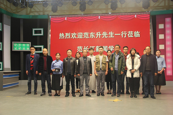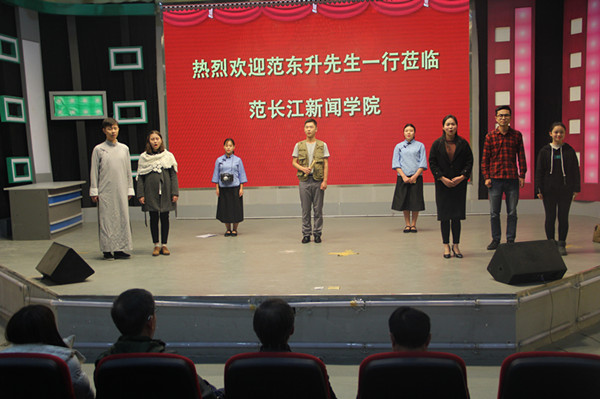 随后公司老师邀请范东升先生于第二演播大厅观看公司学子自排自演的话剧《范长江》,最后,公司领导、老师和范东升先生一行人进行了合影留念。