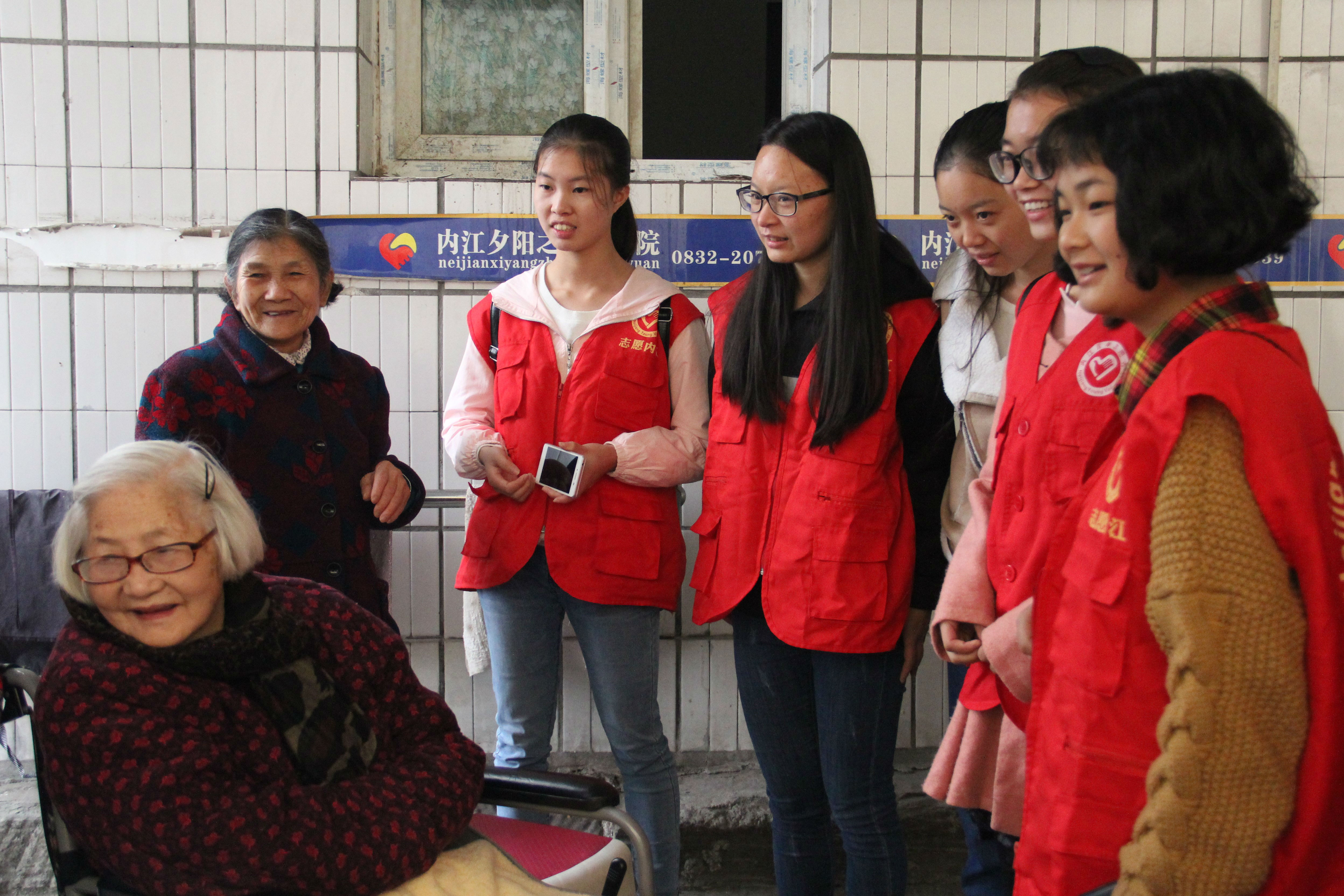 走进托老院,老人们坐在院中,亲切地欢迎着志愿者们的到来,微笑着与志愿者们打招呼。志愿者们陪着老人们聊天,听老人讲过去“抗日战争”、“文化大革命”的故事,90岁的陈奶奶说道:“过去日子过的苦,现在好了,社会发展越来越好,党和国家对我们老年人非常关心照顾,每个月给我们发放补贴,提供优厚的待遇,日子过得越来越好了。”讲到激动处陈奶奶唱起了《打靶归来》、《团结就是力量》等歌曲,激昂的军歌打动了在场的志愿者们。志愿者们为老人们献上自己准备的歌舞节目,院中充满了欢声笑语。