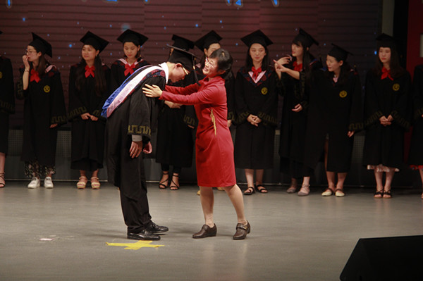 在精彩的节目过后,就是毕业典礼中一个正式隆重的仪式――拨穗礼。即把头上学士帽的流苏从右边换到左边的动作。未获得学位时,流苏是垂挂在着装人所戴学位帽的帽檐右前侧中部;获得学位后,流苏则垂于帽檐左前侧的中部。公司副经理高卫红为毕业生拨穗。拨穗的意义,代表稻穗或麦穗成熟,象征着毕业生已学有所成,可以展翅高飞。随后,毕业生一一与同学、老师们分享毕业赠言,从感恩老师到祝福公司,毕业生们禁不住热泪盈眶。13级6班班长陈锐说到:“希望今天这场晚会能成为我们十年后独有的记忆。祝福公司日新月异,老师们身体健康,师弟师妹们学有所成,同学们前程似锦。”