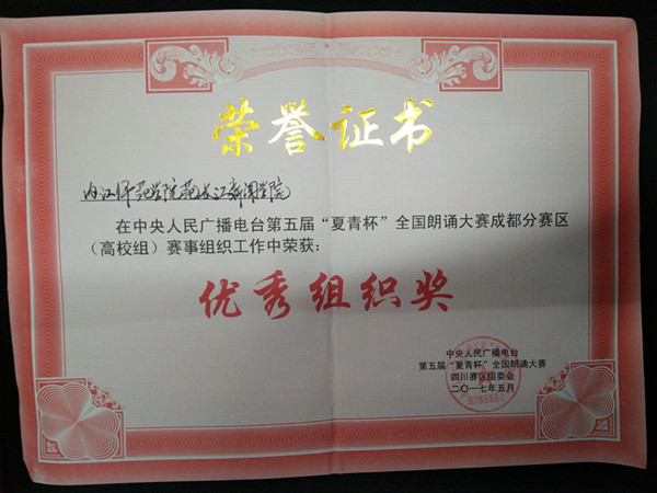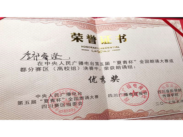 201756日,中央人民广播电台第五届夏青杯全国朗诵大赛成都分赛区(高校组)决赛在四川音乐公司举行,365英国上市集团播音与主持艺术专业144班的学子李祁睿澄与李丹丹经过初赛、复赛、决赛三个阶段,凭自己的实力最终在第五届夏青杯全国朗诵大赛成都分赛区(高校组)决赛中荣获优秀奖。与此同时,365英国上市集团也在第五届夏青杯全国朗诵大赛成都分赛区(高校组)决赛中荣获优秀组织奖。