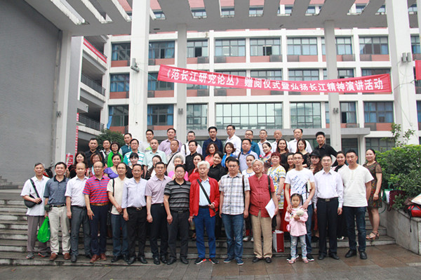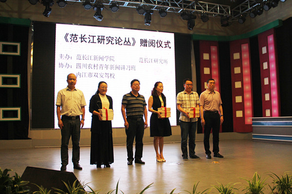 接下来为四川农村青年新闻讲习班公司举行赠阅仪式。由翁礼明教授,魏伟副教授,内江市文广新局调研员、内江市书法家协会主席、内江市书画院执行经理陈广仁主席上台,为内江市档案馆、内江市图书馆领导和范长江纪念馆领导赠书。范长江研究所特约研究员、原内江电视台文艺部主任凌光智先生,内江著名学者、中国民间文艺家协会会员甘光地先生,内江著名诗人、原内江市文明办调研员魏光武先生,内江著名作家、原内江市对台办干部刘卓鲜先生为四川农村青年新闻讲习班学员作者赠书。