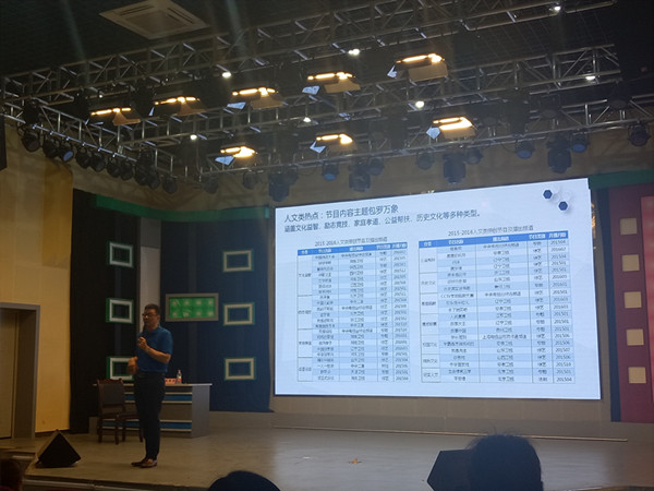 在此次讲座中,杨乘虎教授为参与人员讲解了当前电视综艺节目的发展情况,以及电视与网络新媒体之间的碰撞与融合。他由几组统计数据入手,通过几大卫视近年来综艺节目市场收视情况的对比分析以及各类综艺节目,如情感类、文艺类、音乐歌唱类等类型的节目在电视平台和网络平台的收视成绩对比的具体分析,提出在电视媒介与网络媒介的融合中各类节目的创新至关重要。