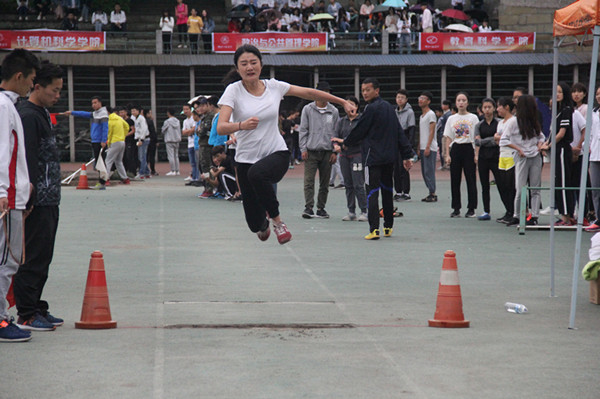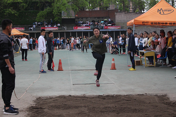 4月20日上午8时,在丝丝凉意中,参加乙组女子三级跳远的运动员们早已检录好并在田径场的跳远比赛区域开始做着热身活动等待试跳。代表公司参赛的是15级的郑祎祎,在昨日的跳远比赛中她获得了理想的成绩。