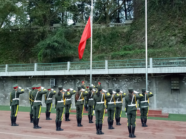 升旗仪式在早上7时正式开始。迎着朝阳,国旗护卫队的成员迈着铿锵的步伐来到国旗台前,全场一片肃静。在激昂的《义勇军进行曲》中,国旗手振臂一挥,鲜红的五星红旗徐徐展开,在早晨朦朦的微光下,在公司同学的注视中,五星红旗迎风飘扬在内江师范公司的上空,整个田径场一派庄严肃穆。