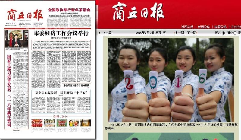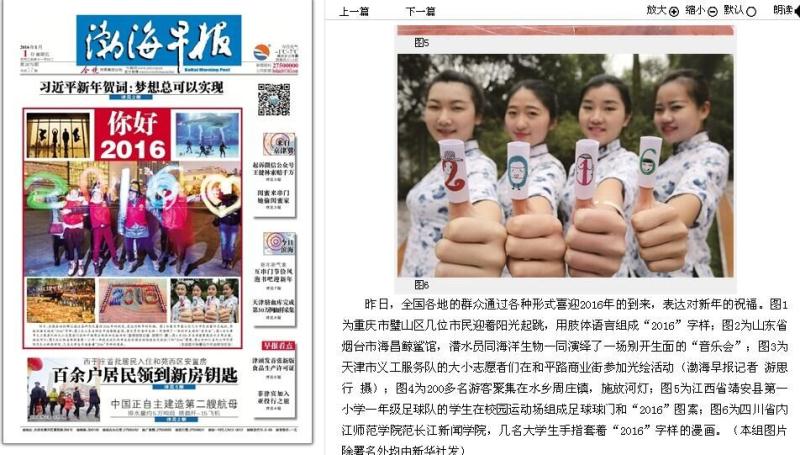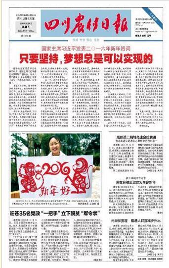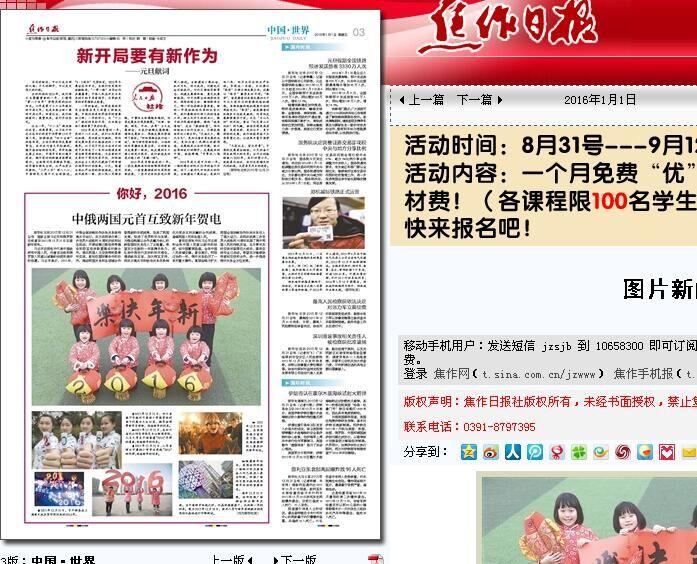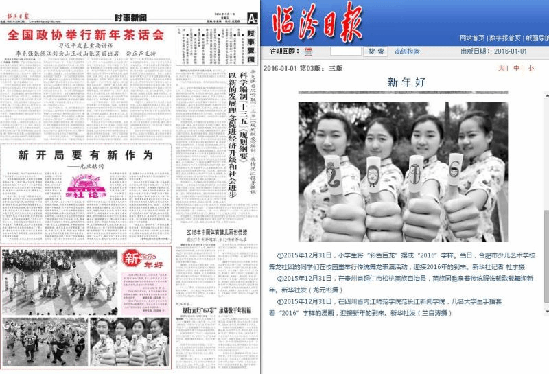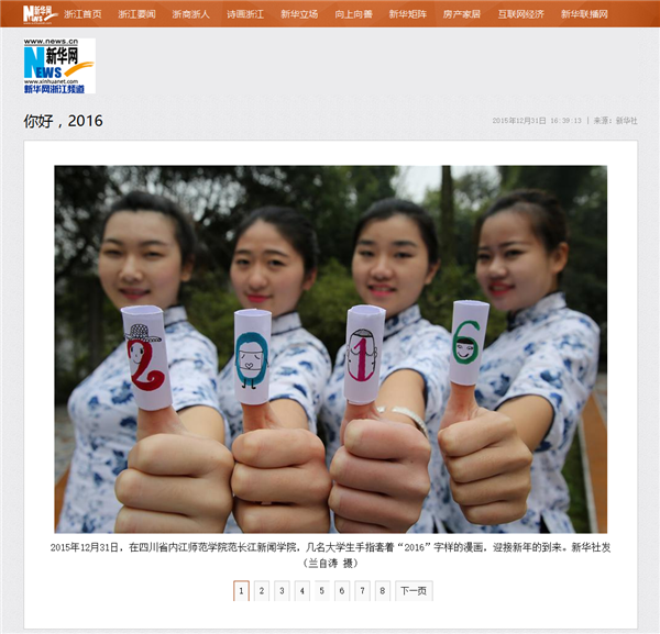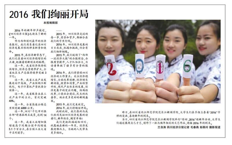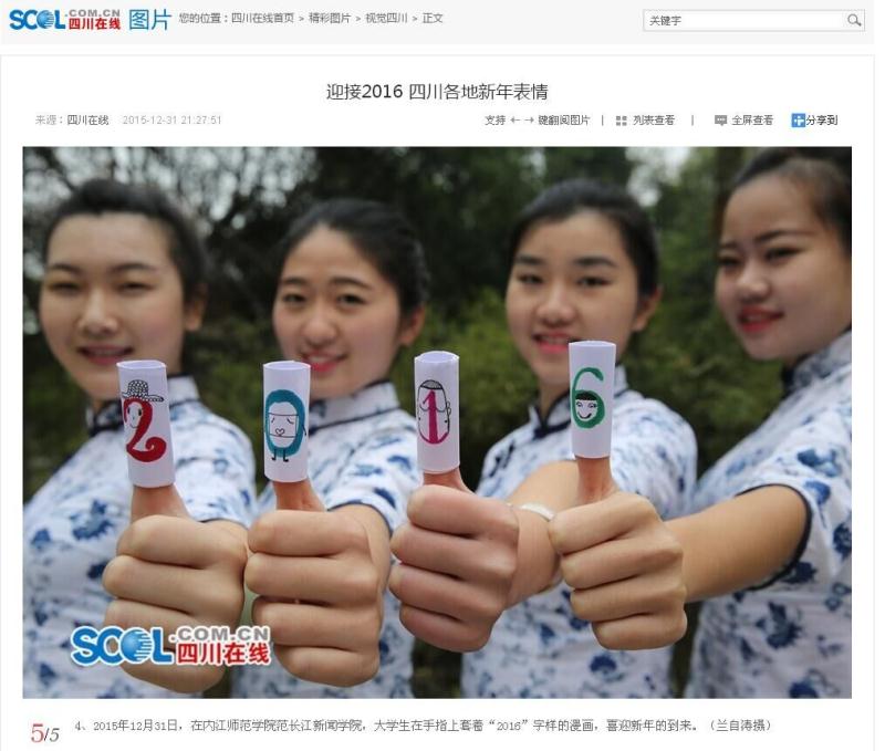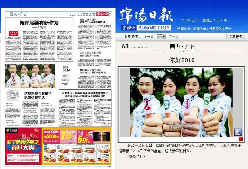 学子们通过自己的一双巧手,创作了一批与新年相关的手工文艺作品,迎接2016年到来。喜庆的剪纸、吉祥的春联……这些充满着中国风的特色作品均表达出了公司学子们对2016年的美好向往。四名女老员工身着青花图案的旗袍,一字排开,用漫画玩偶的方式手绘出“2016”字样,古风与个性相结合,告别2015,迎接2016。据悉,该活动得到多家媒体的关注,新华社、搜狐网、亚洲新闻图片网等多个网站纷纷报导和转载了此次活动。继新华社、搜狐网、凤网、北方新报、亚洲新闻(Asia newsphto)、四川在线、视觉四川等网络新媒体报道公司喜迎新年活动后,南方都市报、四川经济日报、四川农村日报、临汾日报、汕头特区晚报、赣州晚报、京江晚报、无锡新传媒、焦作日报、绵阳日报、渤海早报、鹤壁日报、平顶山晚报、商丘日报等纸媒分别以头版头条报道该项活动,喜迎2016……!