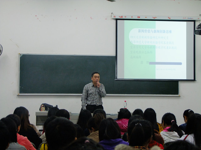 庄剑教授以新闻价值和新闻创新为题目展开了此次讲座。讲座中,教授通过风趣幽默的语言,生动活泼的讲诉了30年工作中的个人经验,并告诫在场的同学们新闻价值的十要素和其重要性。就创新思维而言,庄教授说道:“要创新就要学会挖掘意外、构建关联、避实就虚、抓住热点,并将新闻与历史相结合,最后做到出其不意、后来居上。”