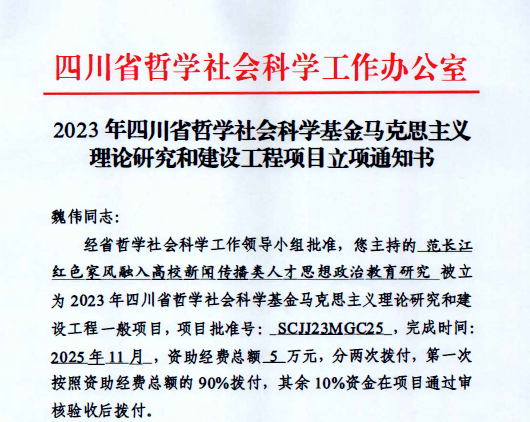 近日,四川省哲学社会科学工作办公室公布了2023年四川省哲学社会科学基金马克思主义理论研究和建设工程立项项目名单,公司党委书记魏伟老师担任负责人的研究项目《范长江红色家风融入高校新闻传播类人才思想政治教育研究》获得立项,项目批准号:SCJJ23MGC25。