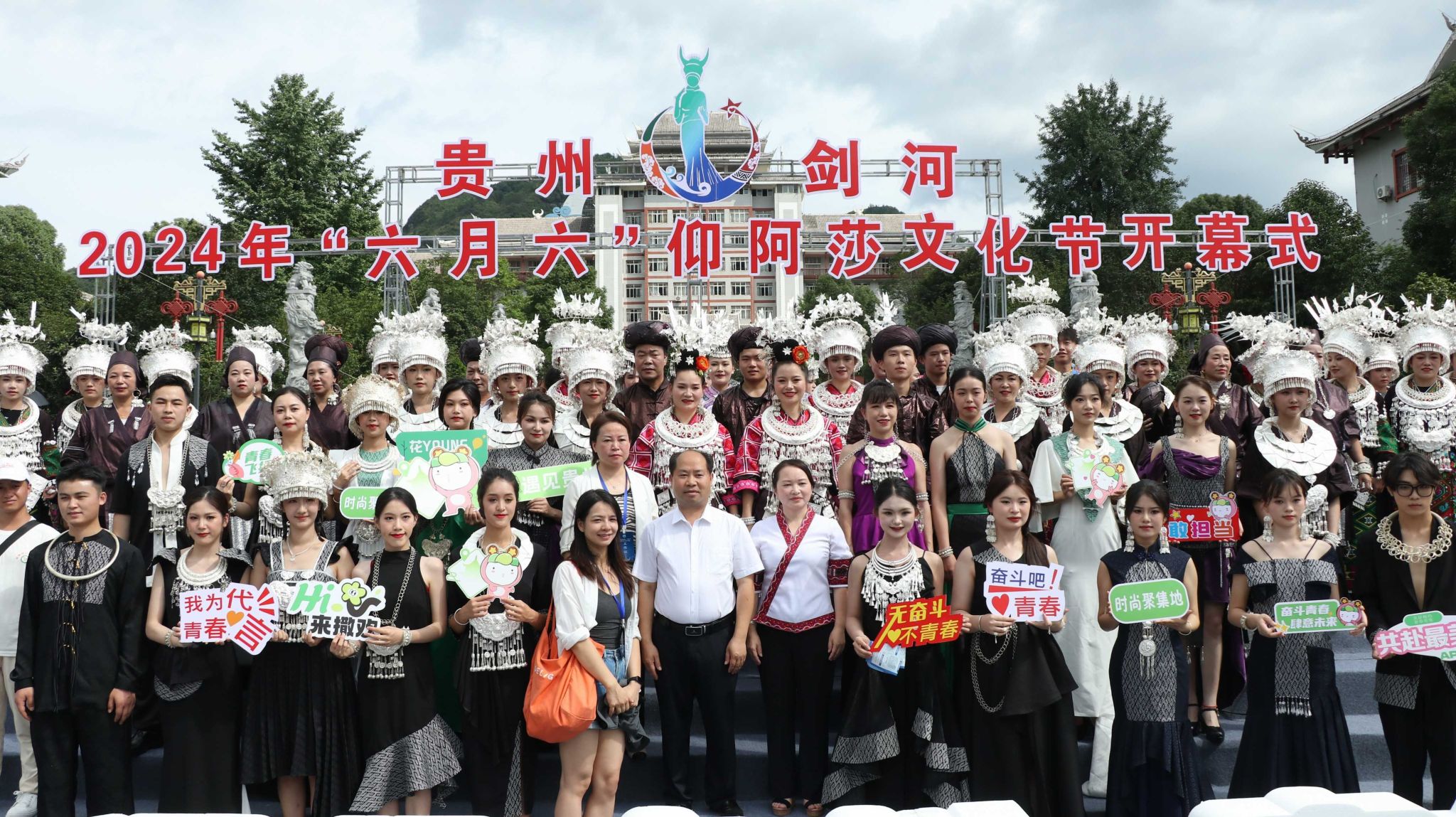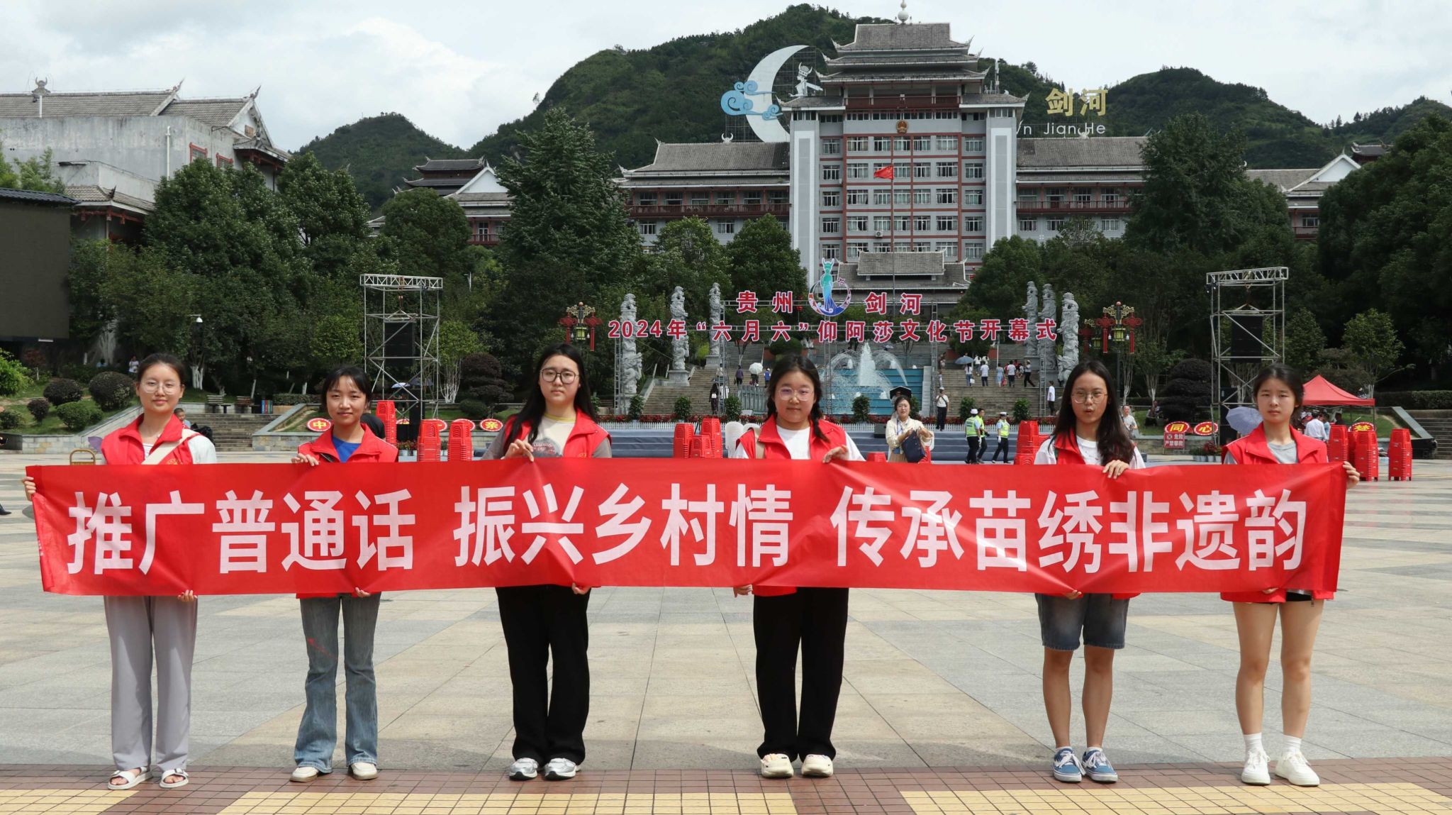 实践团在上午九点到达剑河县阳光广场参加贵州·剑河2024年“六月六”仰阿莎文化节开幕式,歌曲《一起来歌唱》、苗族舞蹈《苗牯牛》、侗族舞蹈《穰穰满家》等精彩绝伦的表演,用音乐和舞蹈带现场观众走进剑河,了解“六月六”。整场演出内容丰富,形式多样,集中展示了剑河苗侗文化精髓。