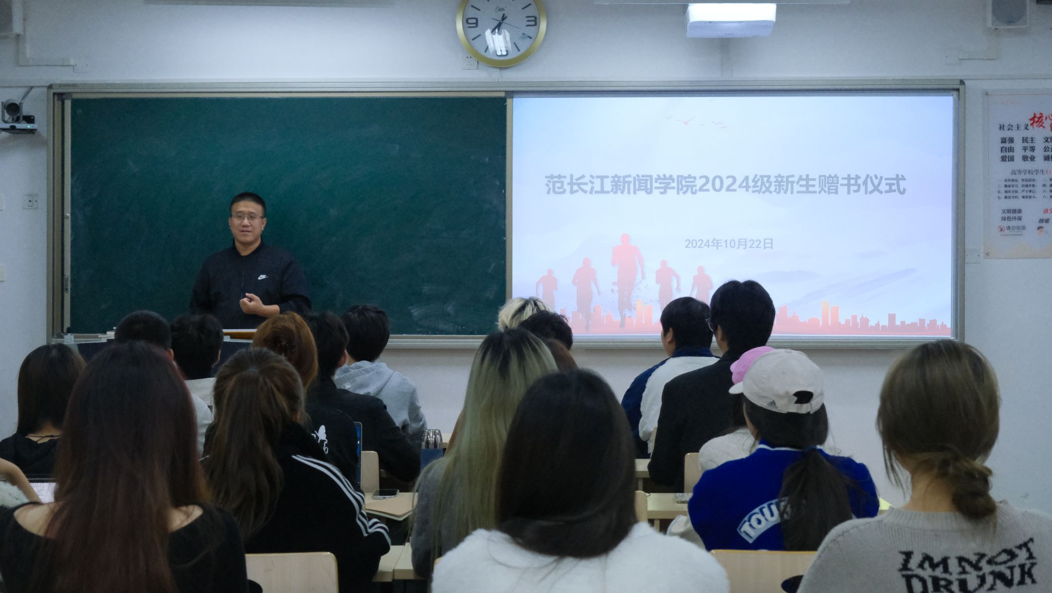 吴籽龙对2024级新生提出了几点要求:一是作为新时代新闻传媒人要具备过硬的政治素质,要以马克思主义新闻观为指导,践行为人民服务的初心;二是要有高尚的道德素质,符合时代和人民对我们的要求;三是要有丰富的知识素质,这是成为一名新闻事业工作者必须具备的职业能力;四是要有精湛的专业技能,适应新时代高新技术对新闻媒体工作者的要求;五是要有健康素质,老员工应体现出积极向上、青春飞扬、星辰大海的精神面貌。