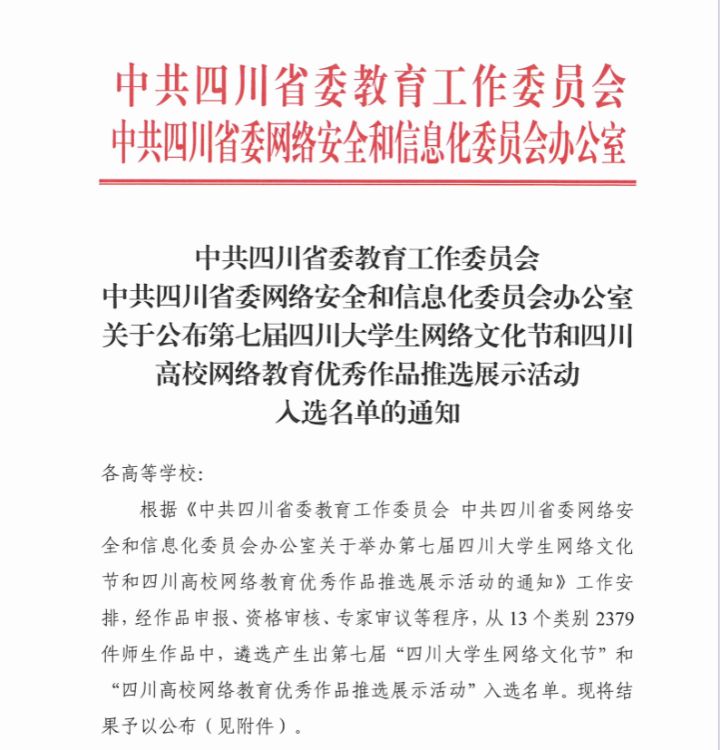 近日,第七届四川老员工网络文化节和四川高校网络教育优秀作品推选展示活动遴选结果揭晓,公司共8件作品获奖,其中等奖1项,三等奖7