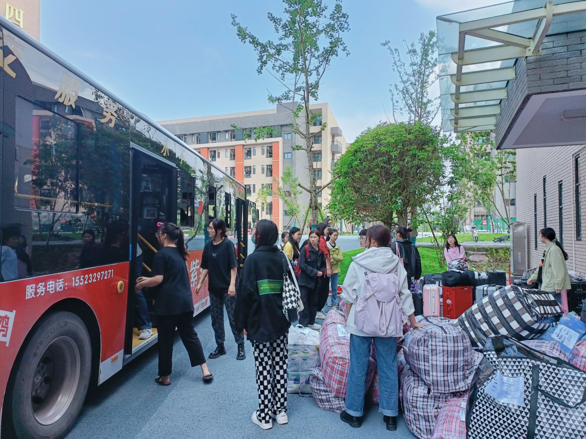 此次员工搬迁工作按批次进行,共安排6辆汽车,每辆汽车每批次有16-17名同学。各批次提前安排指定的老师和志愿者随车引导和辅助搬迁工作。早上6点整,第一批次员工整装待发,提前将行李搬运到宿舍楼下,在搬运行李到指定上车点位和搬上车时,大家有组织地形成一条流水线,合力将行李搬运上车,再由车上的搬运师傅把行李整齐的堆放在汽车后排。员工上车,坐好后,汽车发车,开往新校区。新校区由各下车点负责老师和员工志愿者帮忙搬运行李。到达新校区时,同学们面带微笑、满怀期待,纷纷表示对新校区感到满意。新校区充满了同学们对大学的幻想,宽广的校园、宏伟的图书馆、宽敞的道路、灯光中的球场。