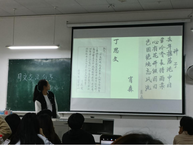 分享会分为两部分:第一部分是“给自己的一封信”书法作品展示,根据学习委员和同学推荐,共选出8位同学(吴诺婷、滕峰、郑利霞、丁思文、肖森、吕星星、余珂岚、郄筱蔚)的书法作品进行展示;第二部分是月文《我和我的家族》分享,共有21位同学的作品入围,按照文章内容分为祖辈,缩影,家风,生活四部分。活动中,董奕程同学热情分享了自己与曾祖母间的故事。余珂岚同学大量运用四川方言,讲述自己对家族故事的所见所文,讲述自己小时候的逸事。王莹莹同学分享了家中祖辈的人生道路。钟丽同学讲述了钟氏从古至今的家族历史。周晓晓同学以族谱为钥匙打开了周氏家族的发展史。郄筱蔚同学主要讲父亲对家族的影响。靳宵同学提到了“家和万事兴”的宗旨和“儿孙满堂,人丁兴旺。”的家族福念。陈晨同学从家族发展史展望未来。刘煜芊同学文字激昂就,又温柔道来家族变迁史。刘九元同学从家族史中映射社会的变迁。吕星星同学感人至深的演讲,讲述祖辈的艰辛和现在来之不易的幸福。郑利霞同学用《双城记》中的名言结尾提醒自己记住历史把握当下。王月同学讲述家族过往诉说辛勤劳动的重要。唐雨欣同学提到家中老人的一些封建思想,讲述家族中不正确的一部分。郭宇星同学一来提出家族特点勤俭节约,从中学习和成长。朱湫林同学则分享了家族的开拓精神。李沛璇同学上台分享了自己被家中的宠爱,语言中尽显幸福。徐薇用略带幽默的语言讲述家中互帮互助友爱的故事。罗沛畦同学主要和同学们聊到了家里的温馨场景。王颜颜同学详细的讲述了家里状况平凡又平淡的幸福生活。罗日甲同学多用第三人称讲述家族的兴衰史。