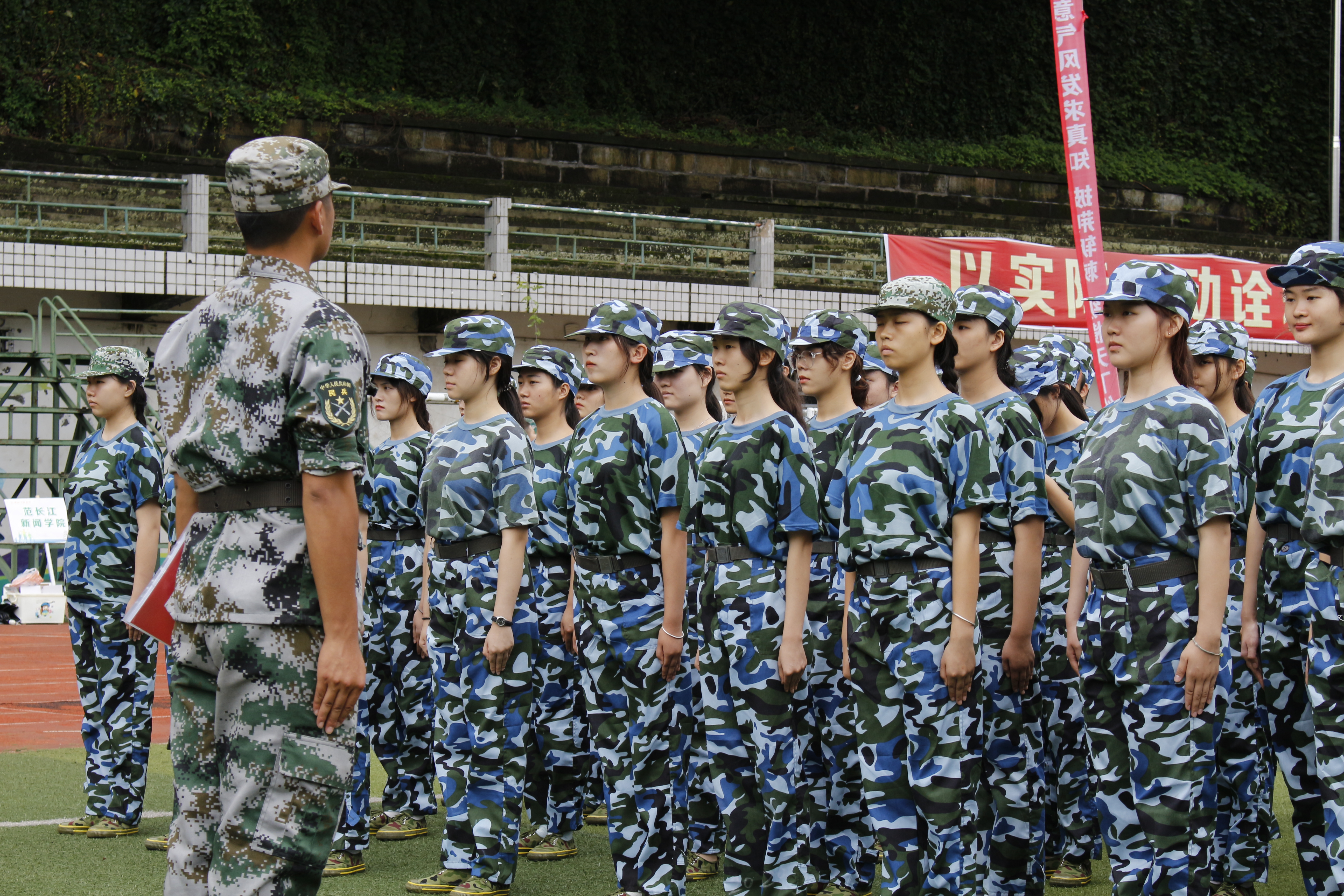 开始训练前,教官们进行了自我介绍,给新生们说明了军训期间的相关规则,随后便开始了军训训练的第一步——站军姿。在教官的指导下,新生们军姿挺拔,精神饱满,积极认真的完成军训的训练任务,整个操场充满了青春的朝气。球场中,红旗边,方阵间,响亮着一句句整齐的口号。在军训的过程中,虽然新生们的脸庞早已流着汗珠,但他们眼神里的热情丝毫不减。