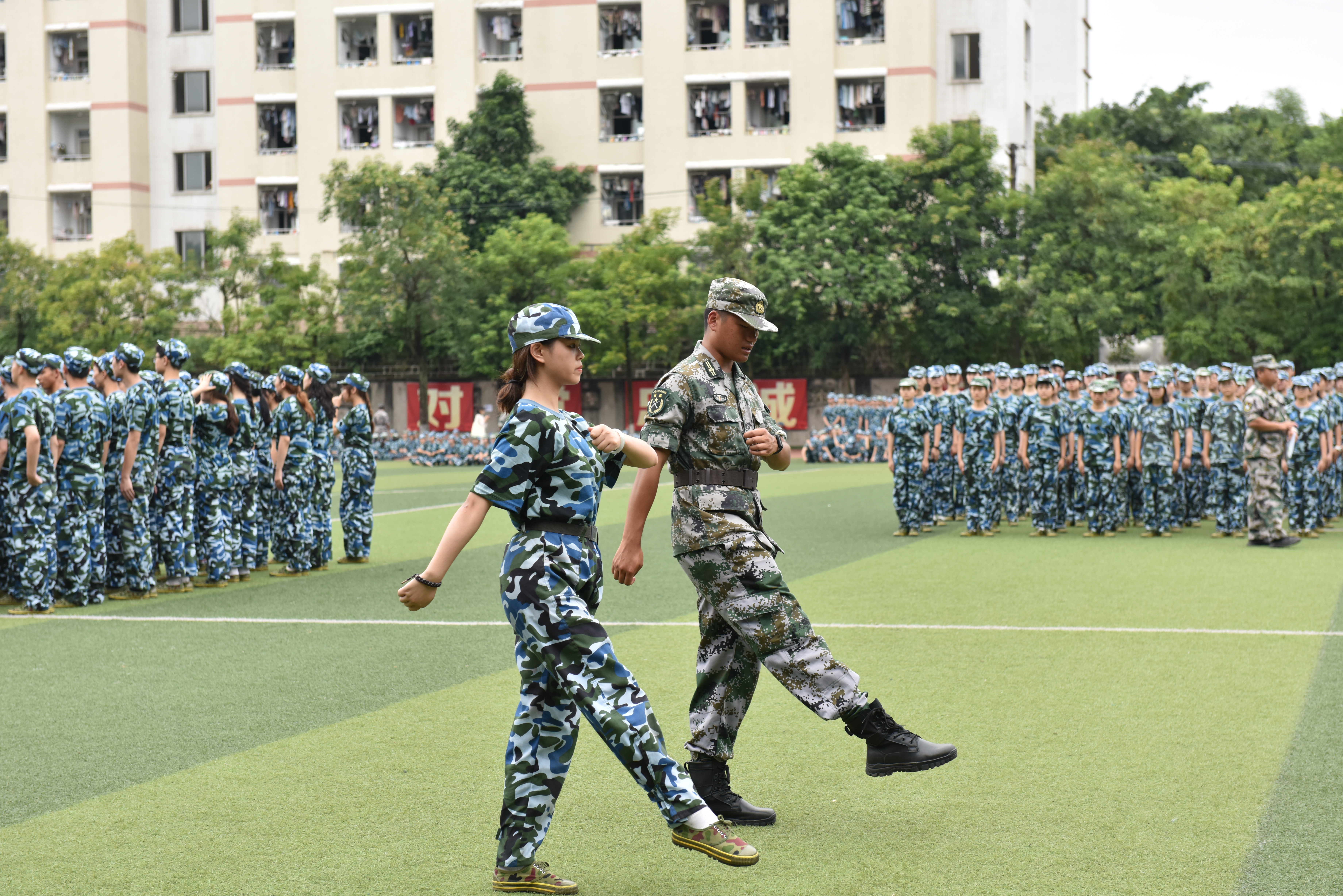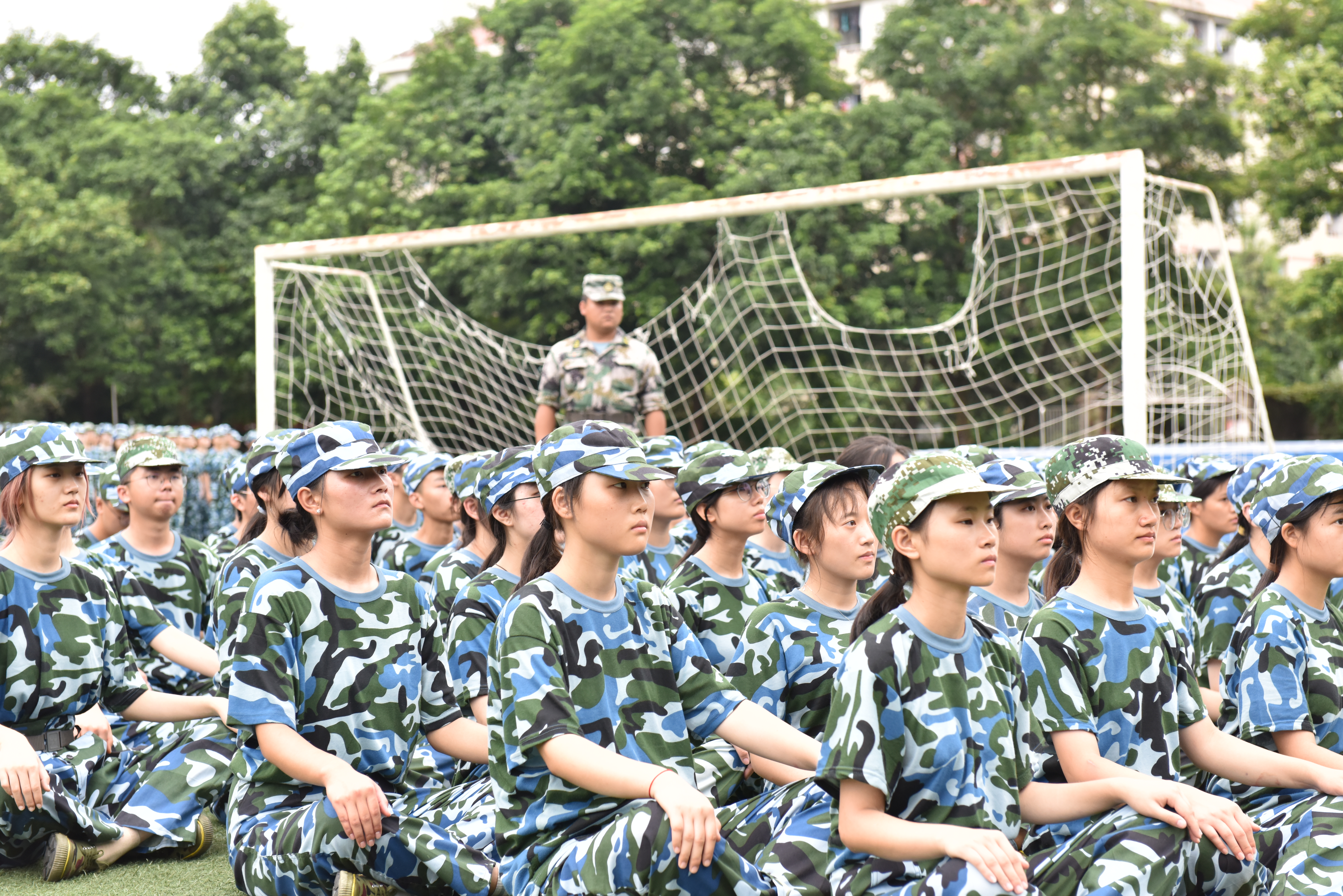 虽然,经过两天的辛苦训练,同学们脸上都略显疲惫。但是,他们的精神却越来越好了,热情不减。第三天的训练内容是走正步,同学们在教官的指导下学习走正步的动作要领。教官们悉心教导,一对一的,一排一排的来回反复练习,同学们走的越来越好,越来越整齐。有辛苦的训练,也会有愉快的休息时间。休息期间,教官们组织同学们席地而坐,学习唱军歌。同学们对于唱军歌还是十分感兴趣的,认真的学,大声地唱,运动场上响起了此起彼伏的歌声。