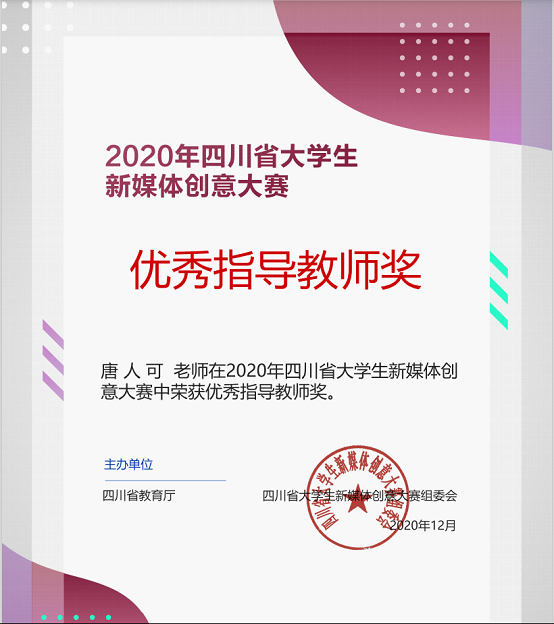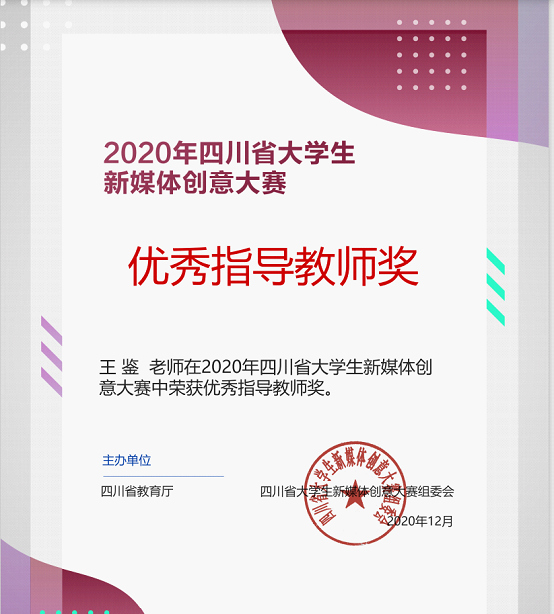 王鉴、唐人可、周祯妮和唐佳几位老师获得大赛组委会颁发的优秀指导教师奖。