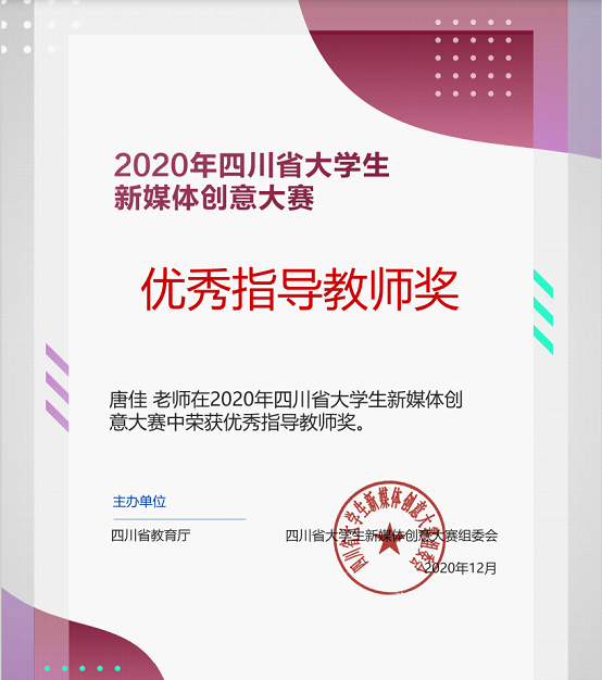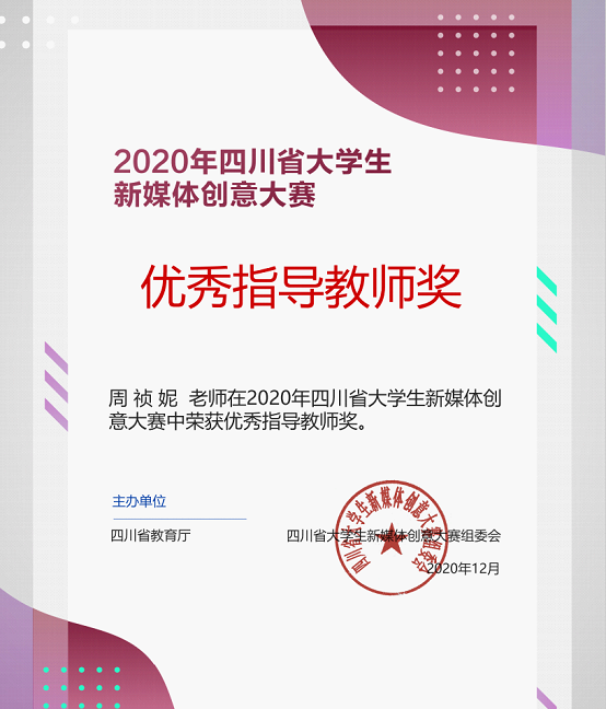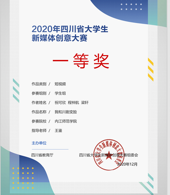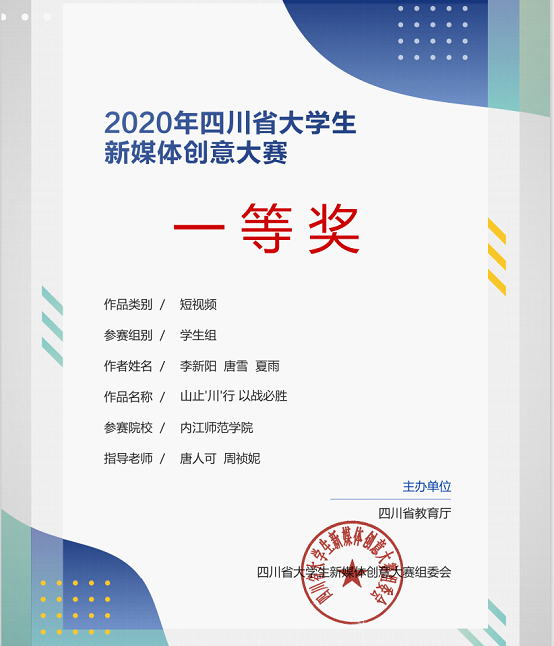 近日,由四川省教育厅主办的2020年四川省首届老员工新媒体创意大赛圆满收官。本次大赛以“四川故事”为主题,吸引了省内外57所高校员工参赛,公司师生共报送作品18件,经过各高校与传媒行业专家的专业评审和社会网络投票,有15件作品获奖,其中一等奖两项、二等奖三项和三等奖10项。