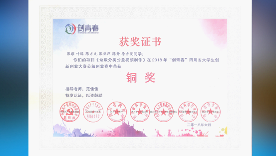 第二组《垃圾分类公益广告制作》报告人陈方元充分展示了团队协作在本次创新训练项目中的作用,报告了本项目公益广告作品在2018年“创青春”四川省创新创业大赛公益创业赛中荣获铜奖的情况,并展示了部分视频作品。