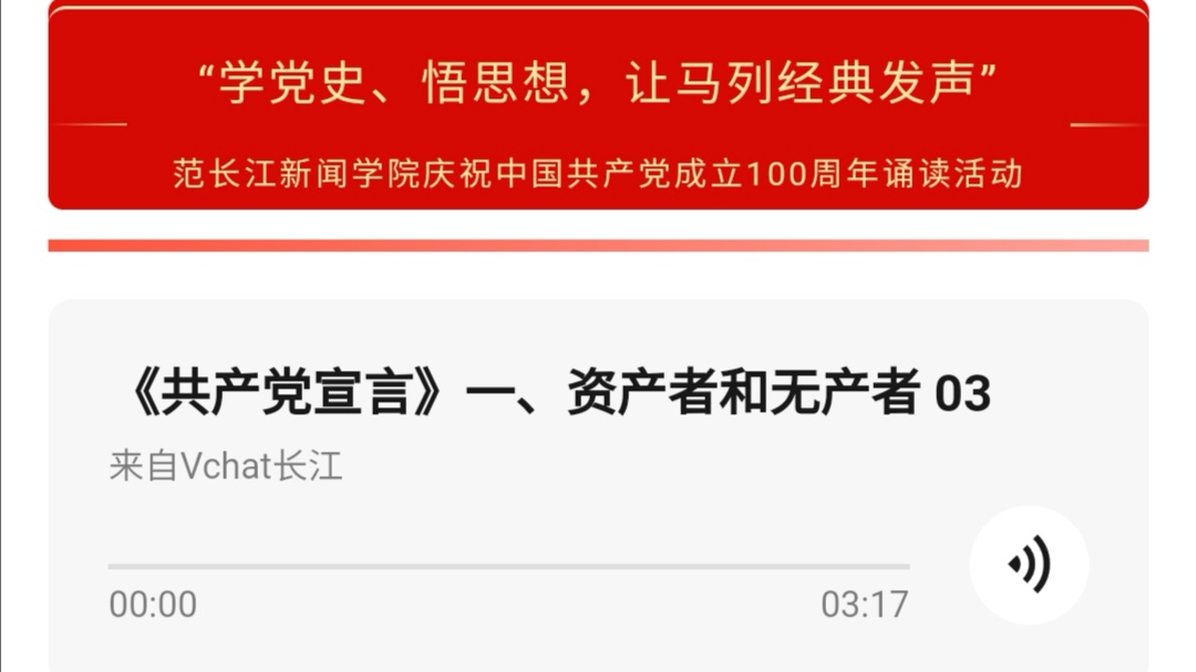 《共产党宣言》是马克思和恩格斯为共产主义者同盟起草的纲领,全文贯穿马克思主义的历史观,是马克思主义诞生的重要标志。为了让师生更好地了解马克思主义经典,学习马列经典原文,公司利用播音与主持艺术专业优势,让“经典+互联网”相结合,由专业教师和员工共同接力诵读《共产党宣言》全文,精心进行线上编辑,以音频和图文结合的形式在公司“Vchat长江”公众号发布。截止4月16日,共推出10期诵读活动,师生积极观看学习并转发,为深入开展党史学习营造了良好的氛围,达到了较好的经典学习和传播效果。