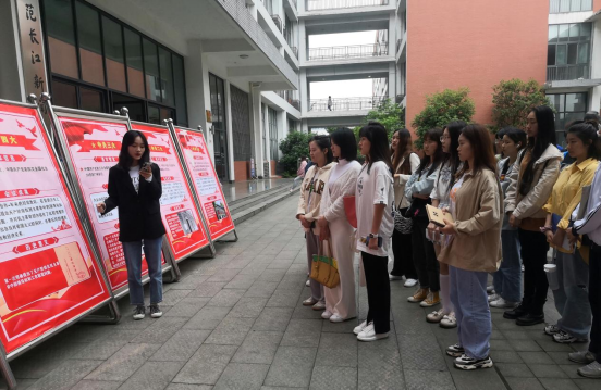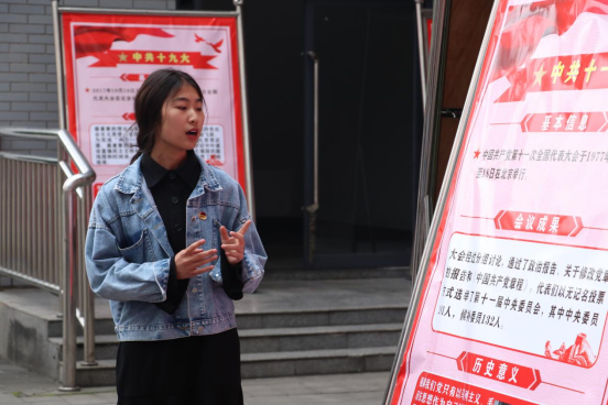 介绍人员由张静怡、王雅璘、李朝阳、谭佳欣四位同学自愿报名组成,几位同学从基本信息、会议成果以及历史意义等几方面为同学们介绍了中共一大到中共十九大会议的情况。全面、详实、真实地展示了中国共产党代表大会的伟大时代意义和在中国国家建设进程中的里程碑意义,出生在“00后”的同学们,第一次系统聆听中国共产党代表大会的历史。在每个展板前,每个同学都全神贯注驻足学习。
