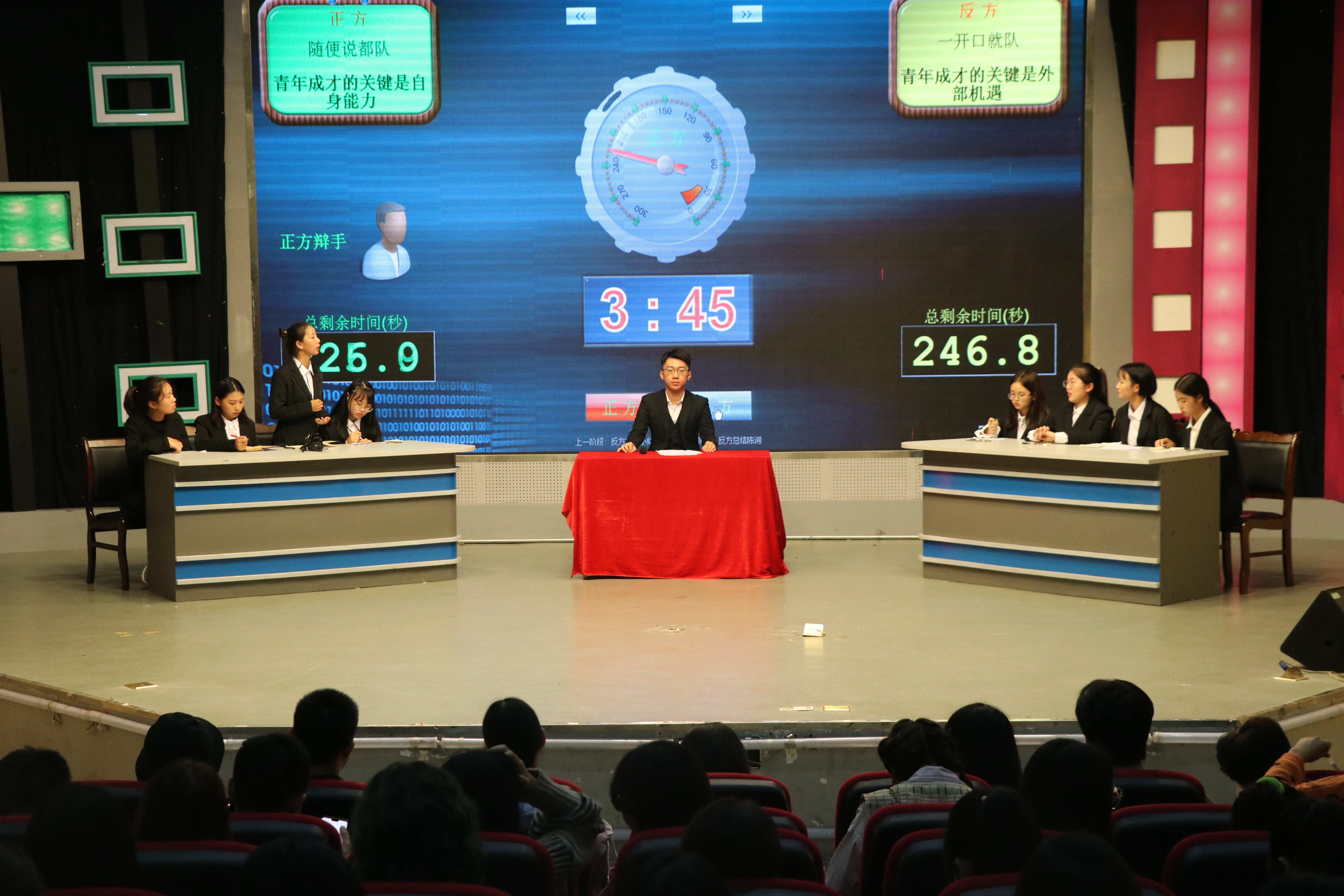 主持人介绍比赛规则及注意事项后,第一轮比赛开始,本轮比赛的辩题是“青年成长成才靠的是自身能力还是外部机遇”。首先出场的是正方代表队“随便说都队”,他们的观点是“青年成长成才的关键是自生能力”,紧接着是反方代表队“一开口就队”,他们的观点是“青年成长成才的观念是外部机遇”。在简单的自我介绍,双方经过正反方辩手陈词、攻辩、自由辩论、总结陈词后,由各位评委进行点评打分,正方最终得分76.5分,反方最终得分77.3分,第一轮比赛反方“一开口就队”胜利。