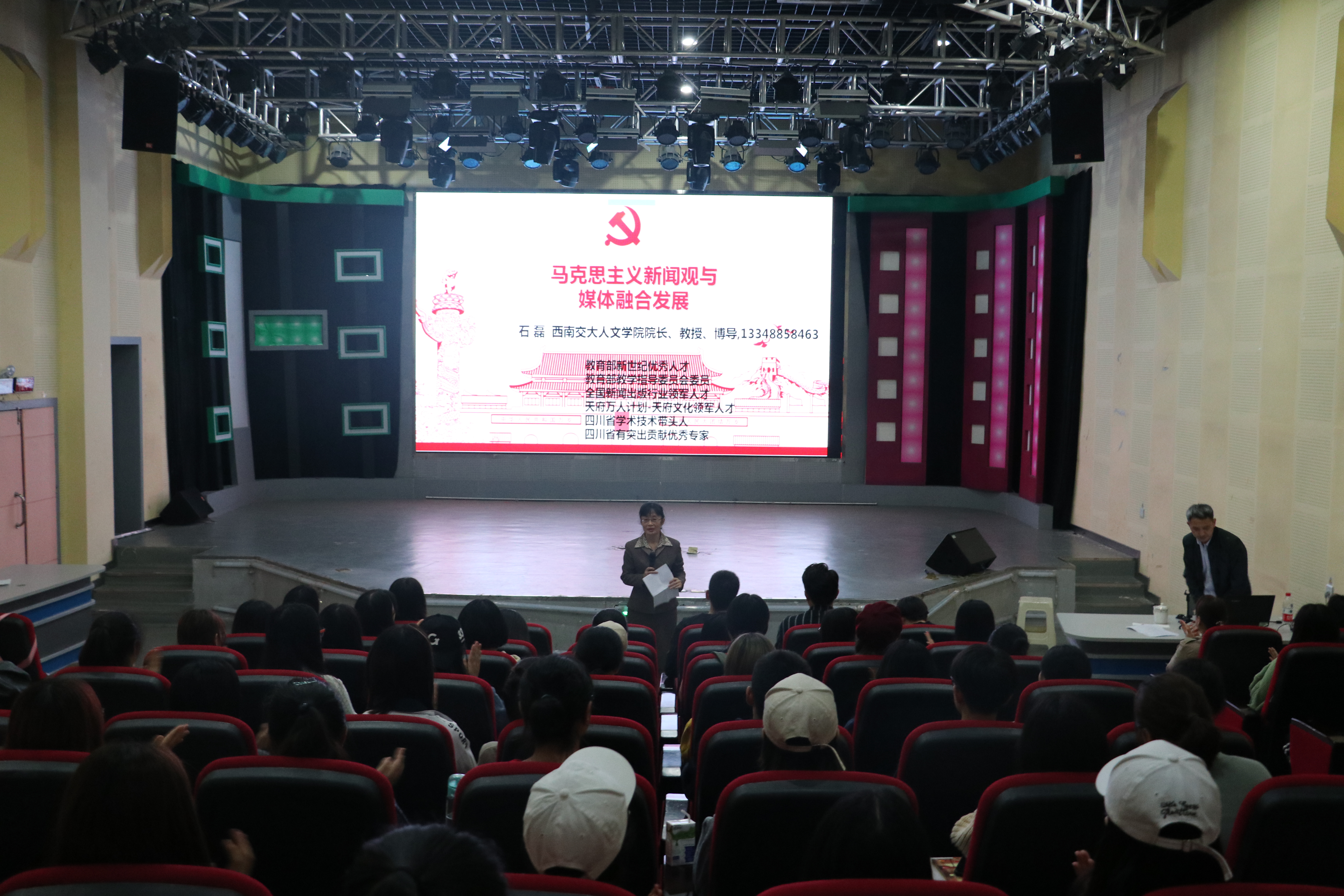 为提升全体同学在马克思主义新闻观上专业理论水平,10月30日下午14时,公司于邀请西南交通大学人文公司石磊教授,于公司129演播厅为做主题为“马克思主义新闻观与媒体融合”讲座。副经理高卫红主持,2017级、2018级广播电视学专业全体同学和老师参加了此次活动。
