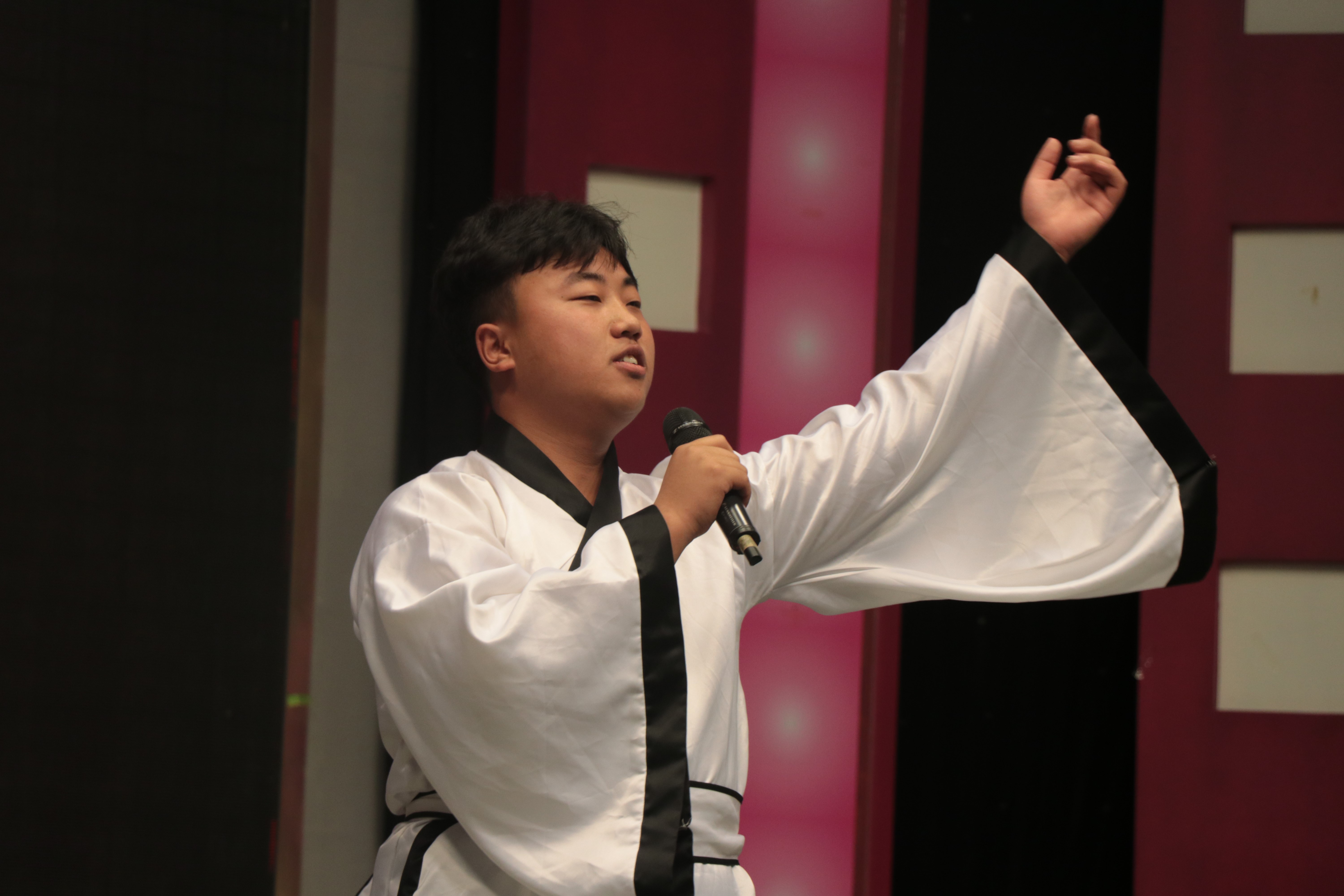 第一项表演为诗歌朗诵,谢平军同学朗诵的《将进酒》振奋人心,感情此起彼伏,颂出诗人的壮志难酬。丁舒同学再次朗诵《永生的和平鸽》,加上优美的配乐,展现出作者对和平的无限向往。以及孙佳宇、裴佳睿、杨久久、段王卓、王海琼、彭睿等几位同学的朗诵也同样精彩纷呈,引人夺目。