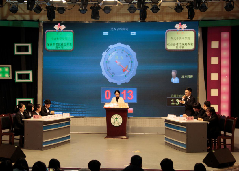 在第二场比赛中,正方一辩以家庭养老的“可实施性、稳定性、延续性”为关键词,强调老人的精神追求和中国传统孝道,以此阐明正方“家庭养老比社会养老更可靠”的观点;反方一辩则以社会养老的“更经济、更专业、更普遍”为关键词,表明社会养老是“大势所趋”,以此阐明反方“社会养老比家庭养老更可靠”的观点。