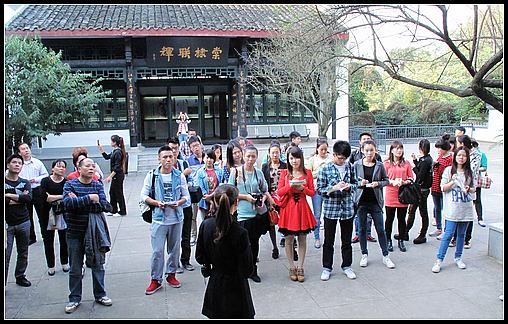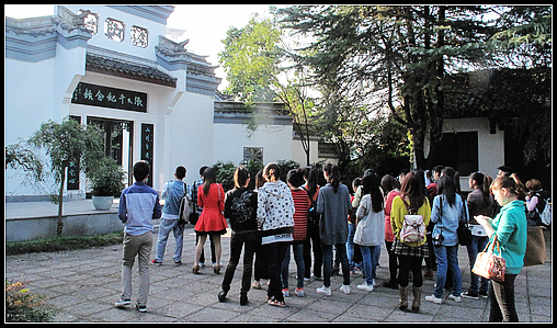 图为2011级4班播音主持专业的同学在2012年10月30日的《新闻写作》课教学中,深入到“张大千纪念馆”进行实地采访和收集写作素材。(播音主持艺术教研室)