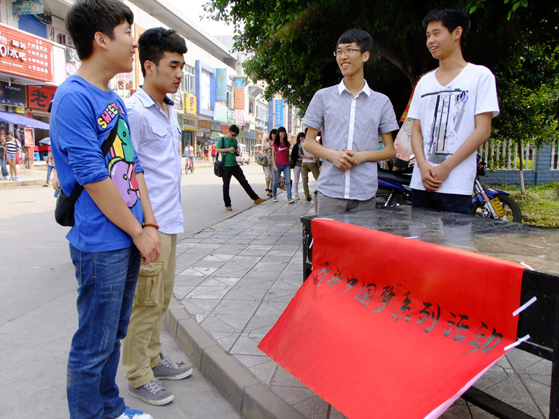 为深入学习贯彻党的十八大精神,引导广老员工为实现国家富强、民族复兴、人民幸福的伟大“中国梦”而发奋学习、不懈奋斗引导广大青年员工深刻学习领会习近平总书记对“中国梦”的深刻阐释,畅谈内师学子心中的“中国梦”,使广大内师学子牢固树立正确的世界观、人生观、价值观,提高员工综合素质,公司承办了由365英国上市集团校团委主办“我的中国梦”主题思想教育活动,4月25日下午4点,文新公司在商业街设点宣传“我的中国梦”系列活动,号召全校同学积极参与活动中来。