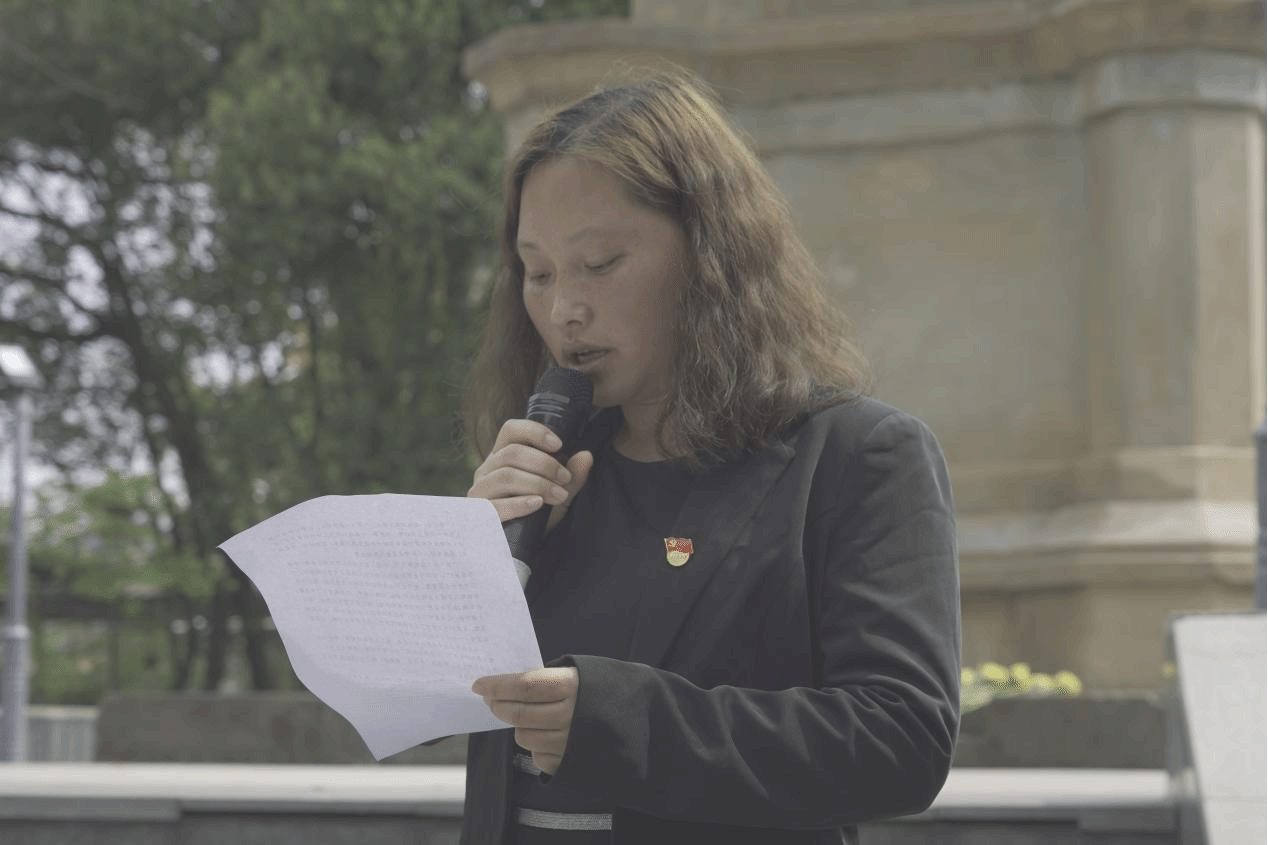 接着,建筑工程公司党委副书记罗冬丽向英烈献词。她带领全体员工党员回顾了筑路民工们的英勇事迹,强调新时代弘扬英烈精神的重要性。她指出,筑路民工的崇高品质与时代精神是中华民族精神的生动体现,他们为国家富强、人民幸福付出了巨大牺牲,并鼓励员工党员应在今后的学习和工作中以英雄烈士为榜样,履行好党员的责任和义务,为实现中华民族伟大复兴的中国梦贡献青春力量。