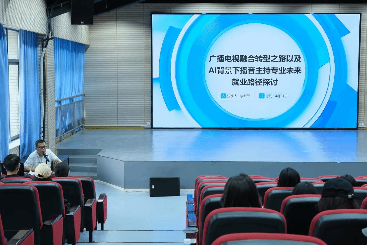 讲座中,李跃军以其丰富的行业实践经验为切入点,全面回顾了传统广播电视行业在面对新媒体冲击时的转型历程。他指出,随着媒体融合的深入发展,传统媒体正经历深层次的结构调整与内容转型,播音主持专业也面临着新的岗位形态与技能要求。他结合当前AI主播兴起的现实案例,分析了技术对播音主持行业的重塑,既提出了传统岗位的危机,也指出了新兴内容场景中对专业人才的强烈需求。李跃军老师特别强调,面对新技术带来的“倒逼机制”,播音主持专业员工要增强跨媒介能力、内容策划力与表达创新力,积极适应媒介生态的变化,探索多元化的职业路径。