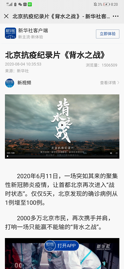 8月4日,由新华社音视频部、新华社北京分社联合出品,中国人口宣传教育中心联合制作的北京抗疫纪录片《背水之战》在新华社客户端推出。截止当天20时,仅新华社客户端的浏览量,就达到了1506509人次。当我们把推文浏览到最后,会赫然发现这一纪录片的解说者正是公司青年教师王帅龙。
