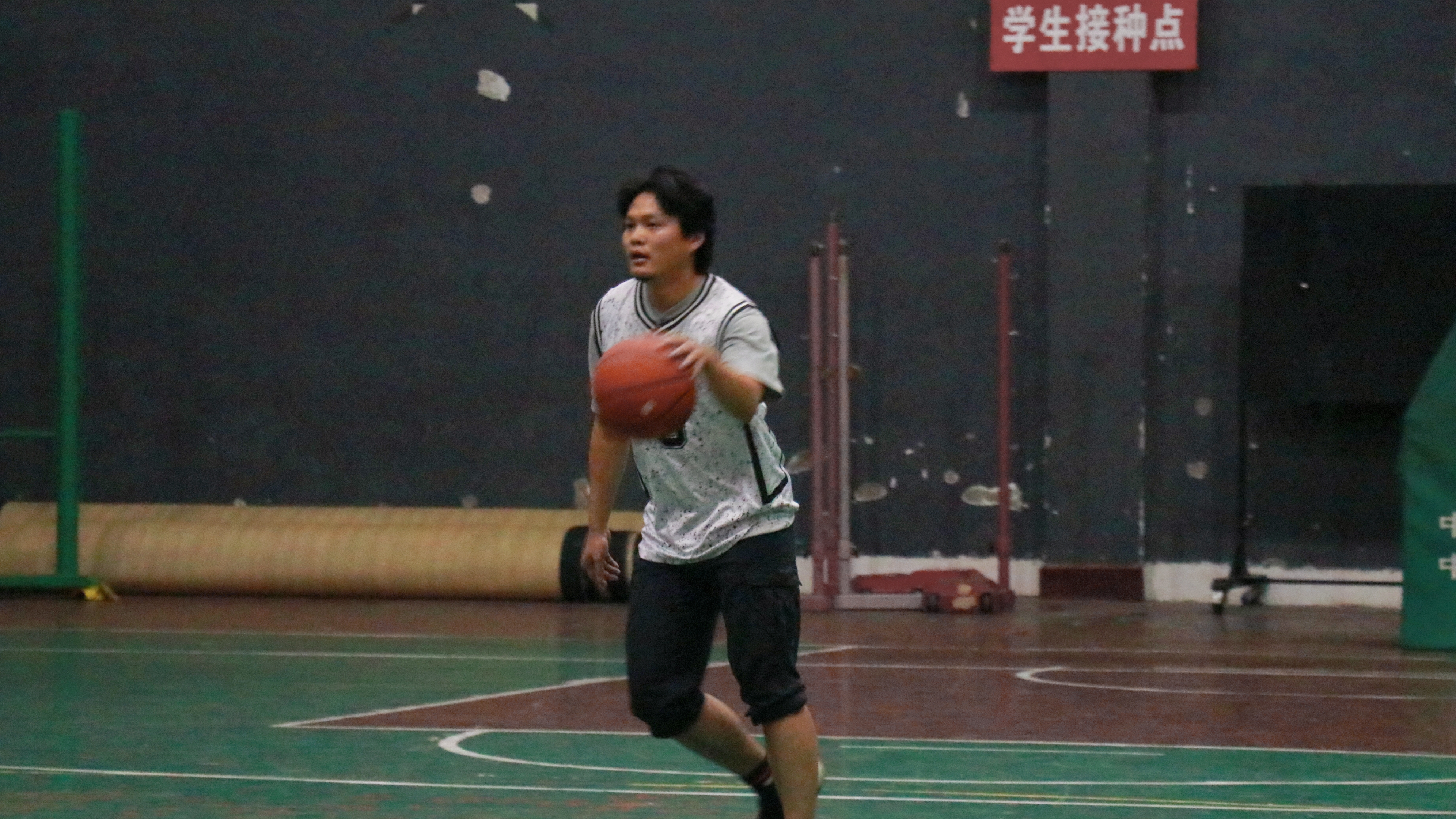 随着裁判一声哨响,比赛正式拉开了帷幕。运动员们都集中精力于赛场上。此刻,老师们展现着与上课不同的魅力,他们充满活力,神采飞扬,与队友们默契配合。男老师充当主力,运球、投篮,活跃于整个赛场。女老师也不让须眉,被篮球砸到也不叫苦叫累,全力配合男老师,赛场气氛逐渐紧张。
