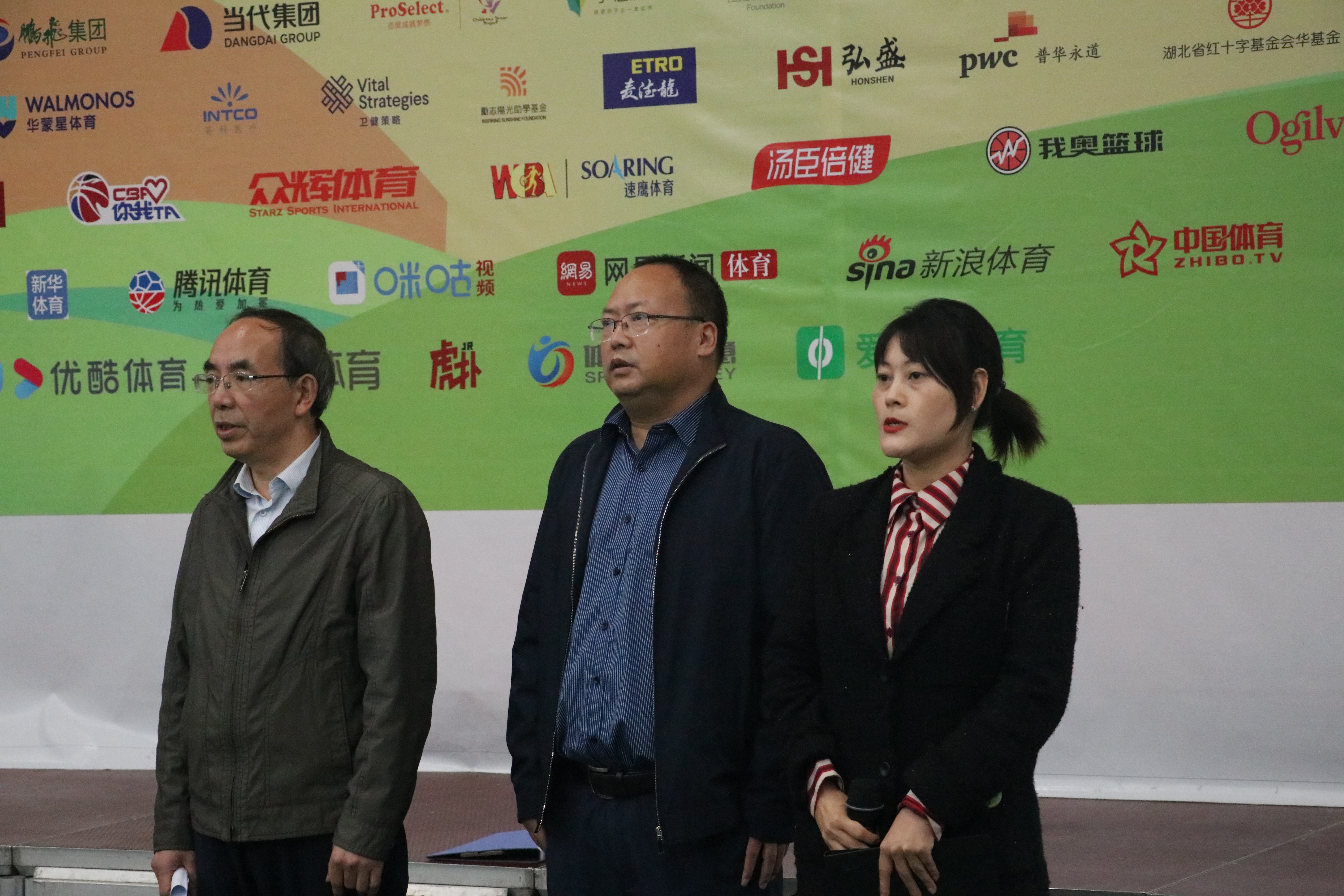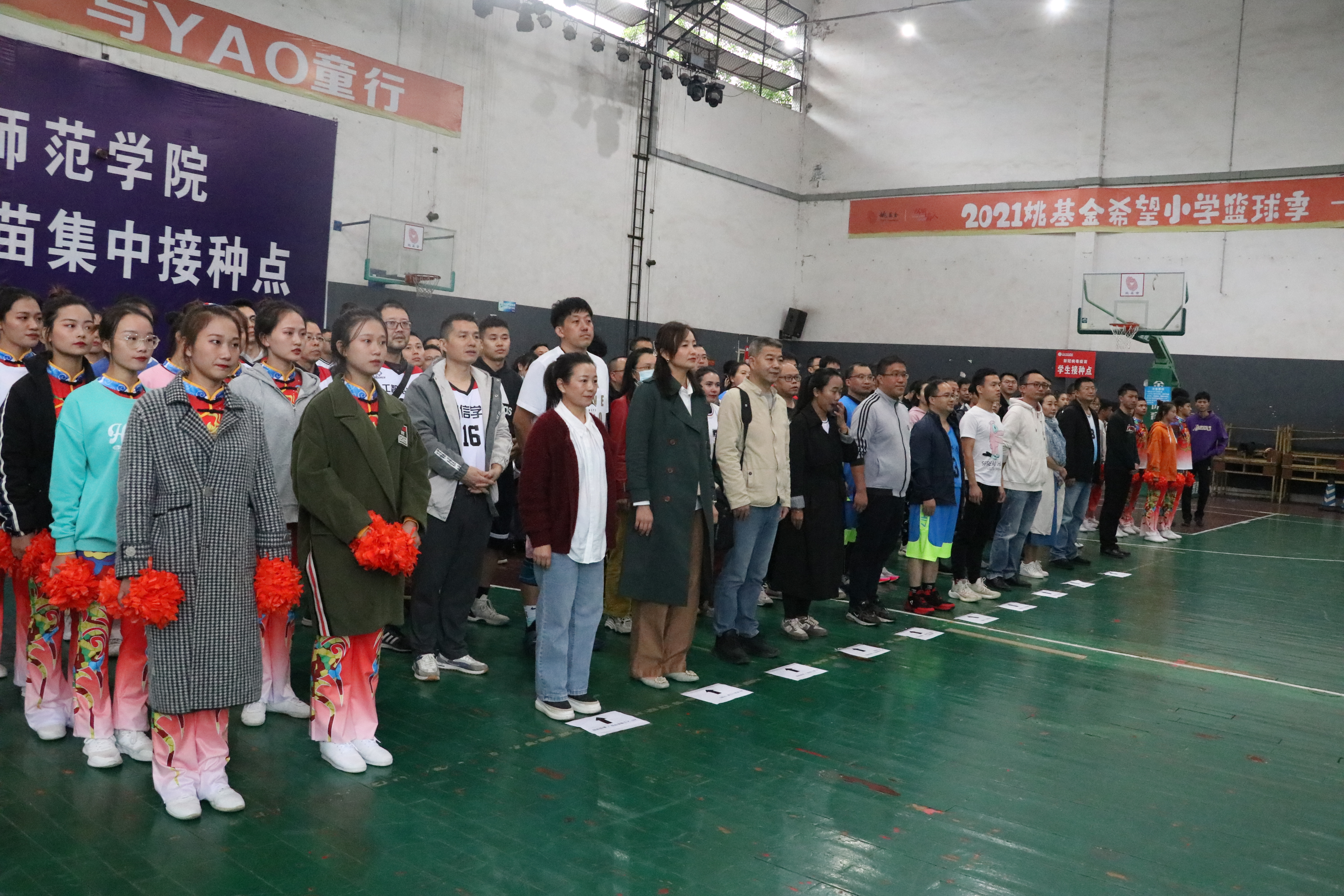 下午5点40,篮球赛开幕式正式举行。首先全体运动员一起奏唱国歌,在公司领导讲话后,由体育公司的员工带来开场拉拉操,同学们精彩的表演极大调动了在场老师的热情。开幕式最后一项是裁判与运动员的宣誓,庄严的誓词显示了比赛公平性。