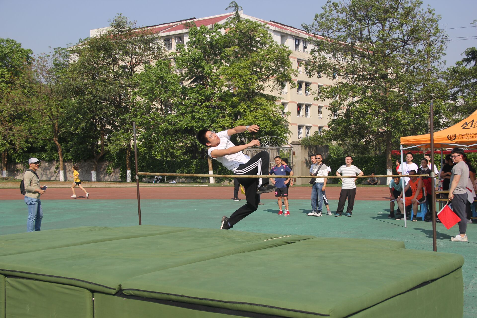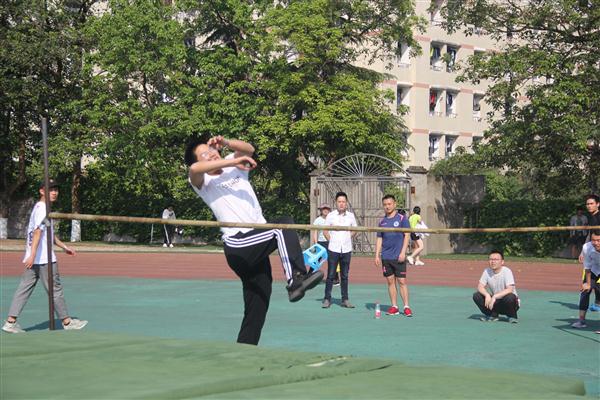 4月18日下午4点,公司教工男子跳高比赛在田径场如火如荼地进行着,代表公司比赛的是邹朝斌老师。跳高是一项技巧非常重要的项目,也同样考验了参赛者的身体素质。