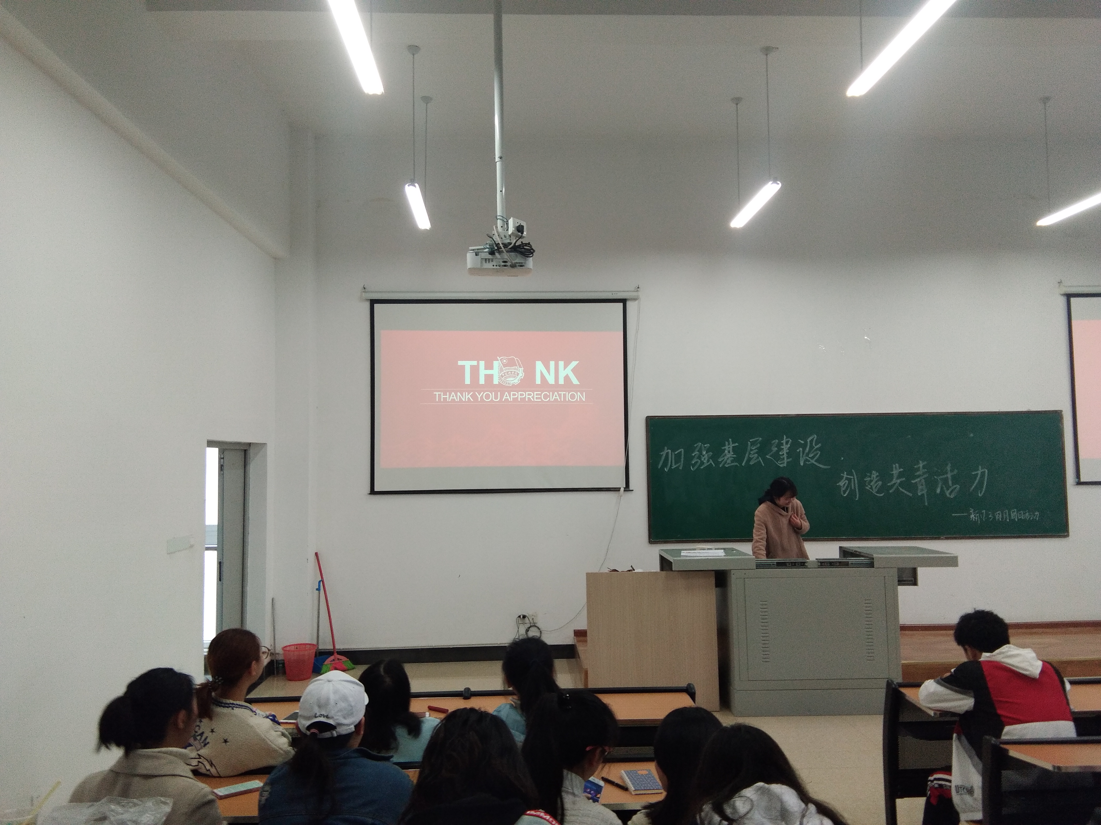 团课在《光荣啊,中国共青团》团歌声中拉开序幕,首先,全体同学重温了入团誓词,通过视频展示等形式回顾了团的历史、性质和任务。本次活动以增强爱国意识,奉献社会为主题,通过丰富多彩的主题活动,在团员青年中弘扬以爱国主义为核心的伟大民族精神,目的就是要求共青团员牢记党的嘱托和团的宗旨,继承团的光荣传统,坚定奋进、和谐的信念,不断增强政治意识、组织意识、模范意识,增强作为共青团员的光荣感、责任感和使命感。