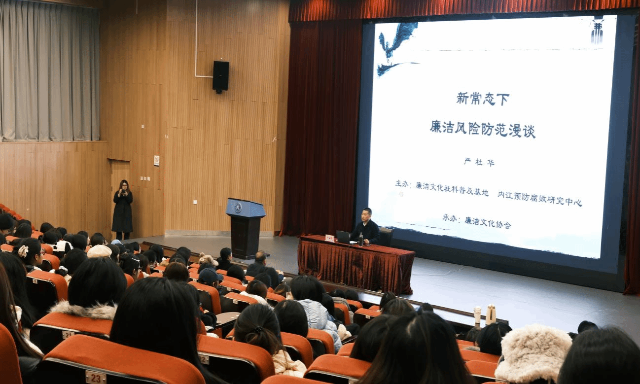 当日下午,由廉洁文化社科普及基地主办的新常态下廉洁风险防范漫谈专题讲座在大千楼A区102讲。严杜华凭借二十余年在乡镇政府、市纪委机关、高校纪委等多岗位积累的丰富纪检监察经验,围绕三大核心议题,结合校园微腐败典型案例,深入浅出剖析学术造假、考试作弊、利益输送等行为的潜在危害,让在场员工深刻认识到廉洁自律需从点滴做起将价值塑造与成长护航深度融合,为青年学子筑牢成长根基。