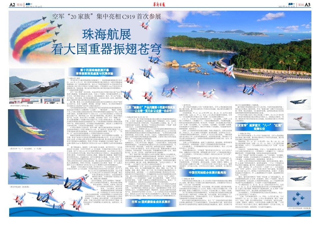 版式设计类作品《华新日报》由陈攀宇同学设计完成,是一份以十四届中国航展为主题的专刊,其内容包括了航空航天新产品的首秀,航空方面一批精兵劲器的飞行表演,航展的流程及闭幕式等,版面整体以天空的蓝色为主。杜可琦老师提到,版式设计这一赛道的参赛作品数量最多,版面主要是大报和小报,种类有行业报、综合新闻、专刊等。总体来看,同学们的作品也都存在细节问题。她建议对平面感兴趣的同学们可以多在颜色搭配、版面设计等方面多做功课,提升自己的编排能力。
