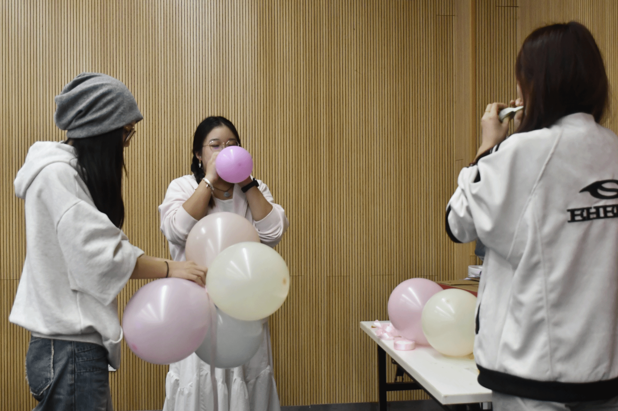 后勤组组长廖惠仪和郭静正在准备闭幕式需要的气球