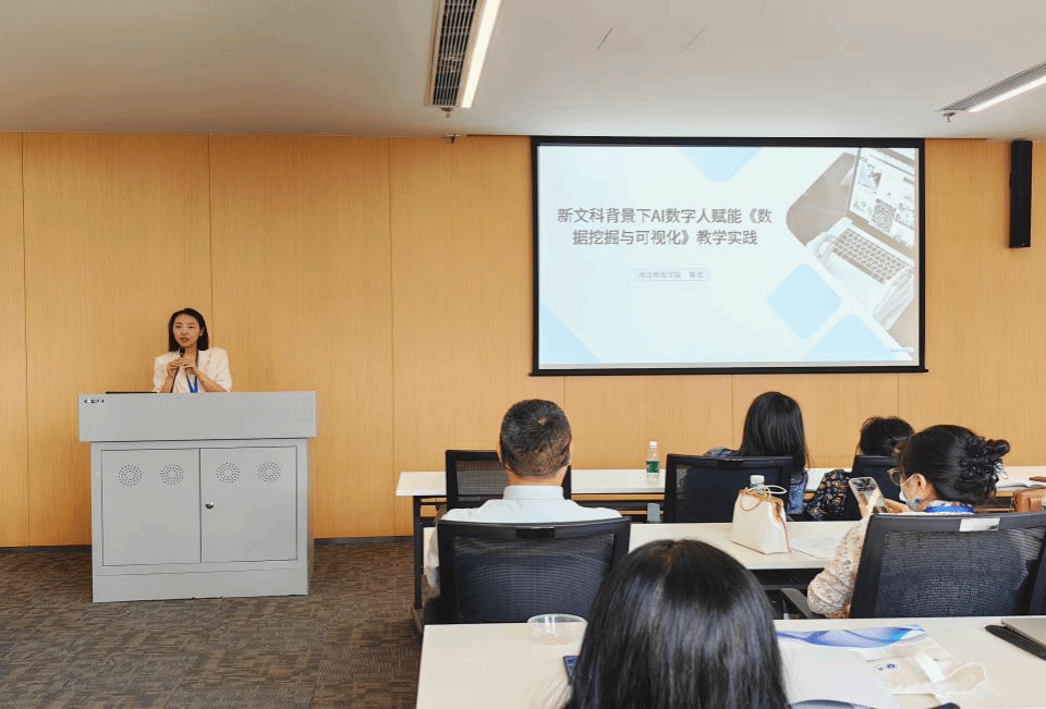 陈佳老师以《新文科背景下AI数字人赋能〈数据挖掘与可视化〉教学实践》为题,分享了网络与新媒体专业课程改革的实践经验。她生动地展示了AI数字人如何成为文科课堂的“超级外挂”。陈佳指出,网新专业有较大比例文科生,面对数据挖掘与可视化课程时普遍存在“技术恐惧”。公司通过构建智能化教学平台、创新教学方法、优化评估机制及跨学科团队合作,全面推动AI技术与新闻教育的深度融合,实现“技术赋能、人文引领”的教学改革目标。有现场参会学者评价:“陈老师的实践为文科生学习技术课程提供了新思路,真正实现了‘用数据讲好故事’。”